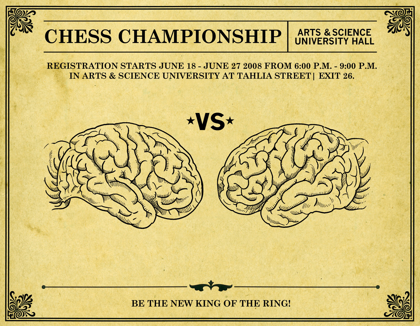 Стань королем ринга, шахматного рингаImpact BBDO приглашает всех желающих на удивительное шоу - университетские соревнования по шахматам. Постер выполнен в традиционном для подобной продукции стиле, за исключением того факта, что вместо мужественных боксеров перед зрителями предстает боевой инструмент шахматиста - мозг.Будь новым королем ринга! Агентство: Impact BBDO Riyadh, KSA Креативный директор: Ahmad Beck Копирайтр: Ziad Chehab |