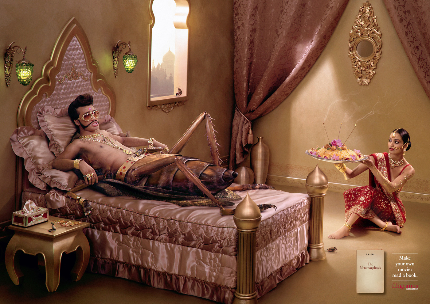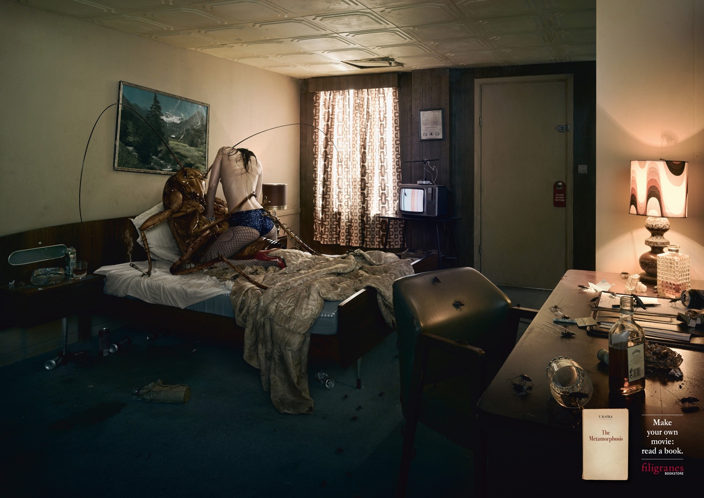 Метаморфозы рекламы от книжного магазина filigranes и РА AirБельгийское агентство Air, в ранках рекламной кампании книжного магазина filigranes, на примере книги Франца Кафки "Метаморфоза" показывает зрителям, что читать книги не менее увлекательно, чем смотреть кинофильмы. Постеры, которые РА Air оформило в соответствии с канонами школ кинематографа, говорят о различиях в восприятии прочитанного между людьми и акцентируют внимание на том, что кино всего лишь дает возможность увидеть чужую, не всегда подходящую вам как личности, интерпретацию событий. В то время как книга позволяет читателю нарисовать картину происходящих событий, как ему пожелается.Создайте свое собственное кино - прочитайте книгу Агентство: Air, Brussels, Belgium Креативный директор: V?ronique Sels Арт директора: Sophie Norman, Nam Simonis, Anthony Hirschfeld Копирайтер: V?ronique Sels Фотограф: Marc Paeps |