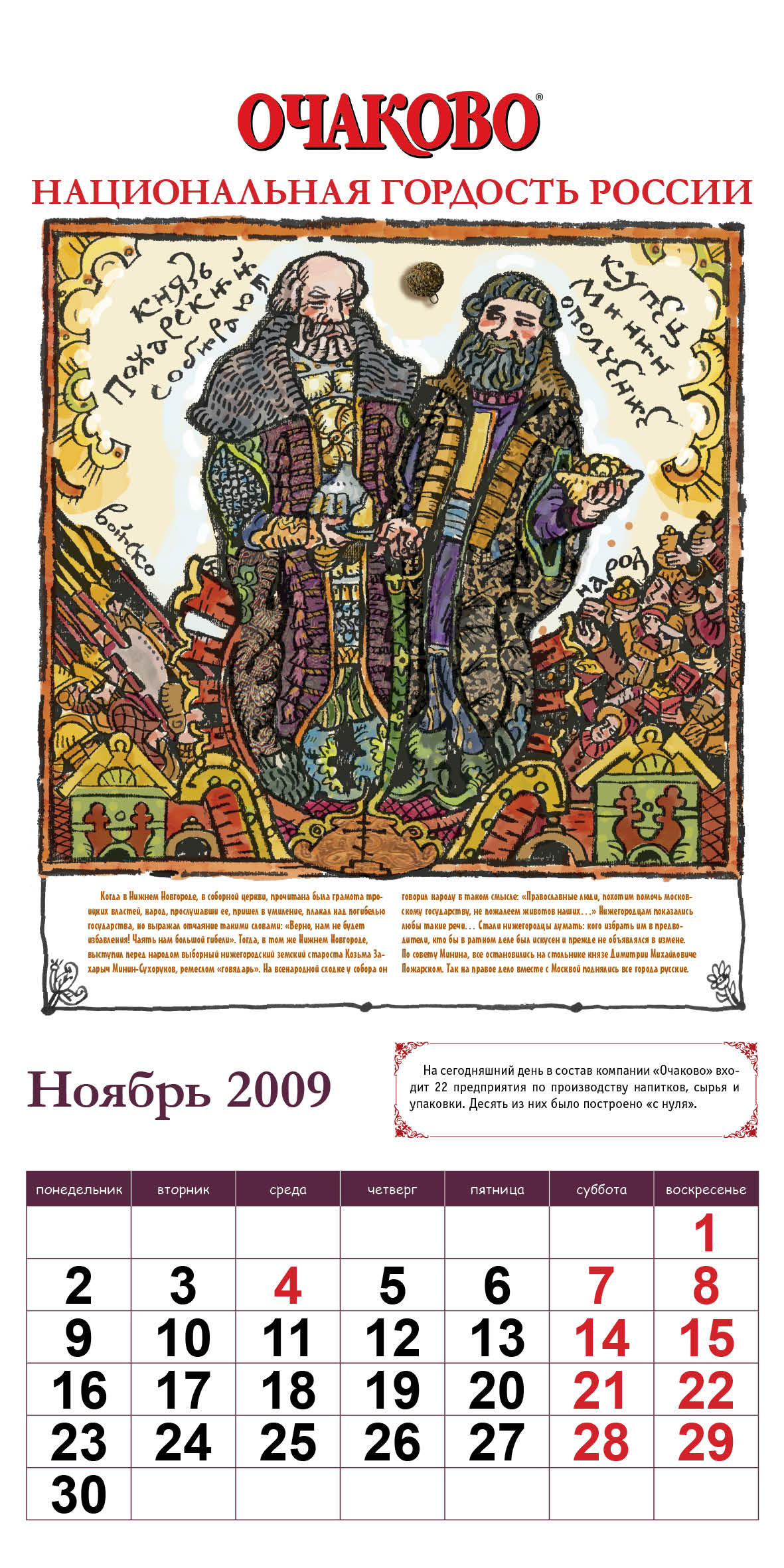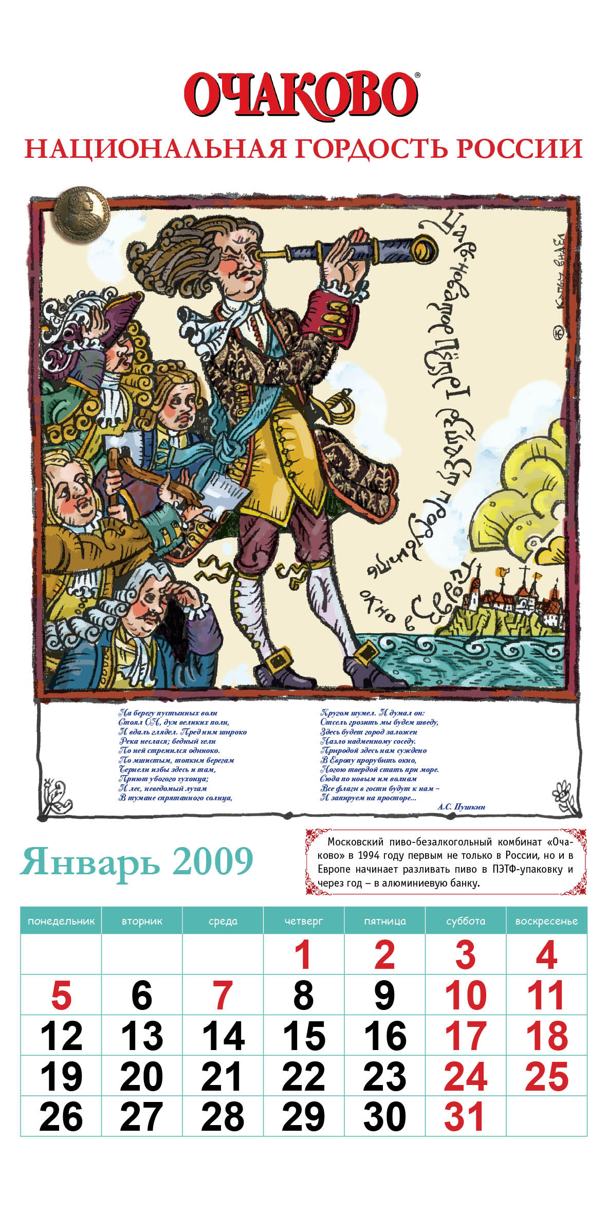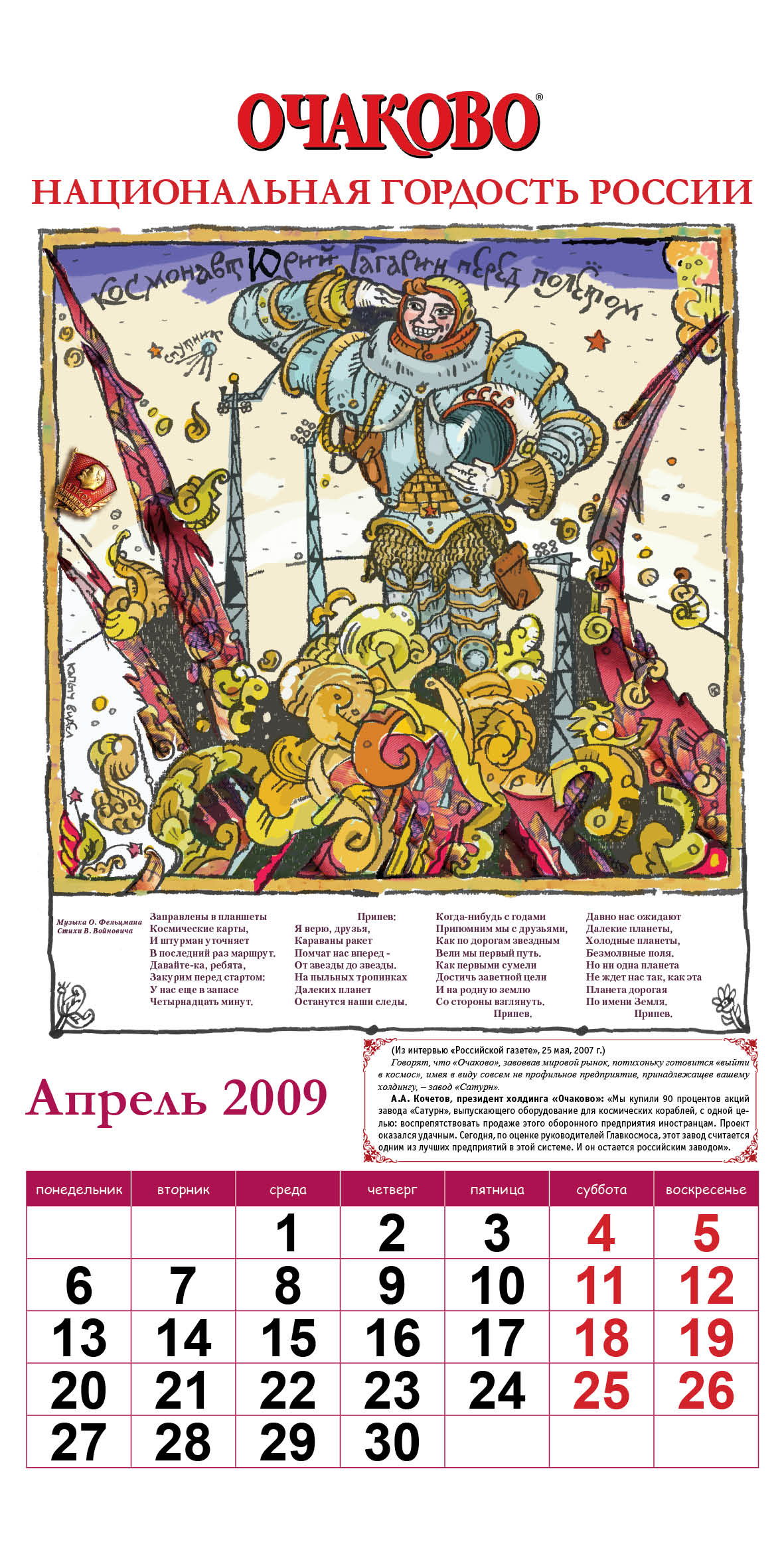 Добрыня Никитич и Юрий Гагарин - герои "Очаково"Компания "Очаково" выпустила календарь "Очаково. Национальная гордость России" для сотрудников и партнеров компании.Основная идея календаря - продолжение славных русских традиций и возрождение исконно русских напитков компанией "Очаково". Стиль, в котором календарь выполнен - ассоциативное рисование, основанное на национальных русских традициях и фольклоре. Оно несет в себе современные социальные тенденции, а также новое звучание русских традиций в искусстве и в восприятии современного человека. "Мы продолжаем реализовывать концепцию национального традиционализма, которая уже была отражена в книге стихов "Народный квас "Очаковский"". Эта идея позволяет отразить позитив и инновационность, которые несет в себе наш бренд", - рассказала руководитель пресс-службы компании "Очаково" Елена Петлина. Состав творческой группы Разработка идеи: пресс-служба компании "Очаково". Художник: Капыч. Создание макета и верстка: РА "Ателье Вентура". Пресс-служба МПБК "Очаково" |