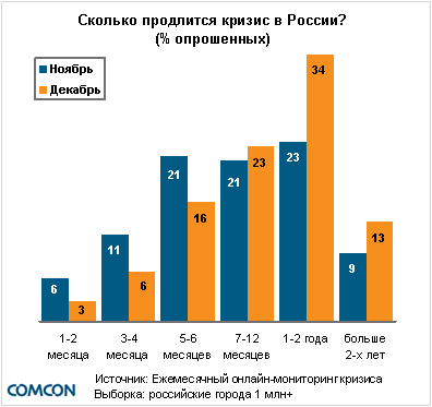 Все больше россиян полагает,что экономический кризис продлится больше двух летКомпания КОМКОН продолжает публикацию результатов мониторинга реакции россиян на экономический кризис. Получены данные второй волны кризисного мониторинга, декабрьский опрос проводился с 1 по 9 декабря через интернет-панель. В опросе принимают участие жители российских городов-миллионников в возрасте 18-45 лет.Данные показывают, что все больше россиян считает, что кризис продлится более двух лет - за прошедший месяц число респондентов, считающих так, увеличилось почти в 1,5 раза. Также на 50% выросло число тех, кто считает, что кризис продлится от года до двух лет. Сейчас эта категория россиян находится в большинстве и составляет 34% от всех опрошенных. Все больше жителей городов-миллионников становятся экономными в своих тратах. Таких на сегодняшний день уже подавляющее большинство. Доля тех, кто стал более вдумчиво и осторожно относиться к собственным расходам, выросла с 66% в ноябре до 75% по результатам декабрьского замера. Сравнение данных двух волн мониторинга (ноябрь и декабрь), отражающих в том числе финансовый и потребительский секторы, будет представлено 17 декабря на совместной конференции КОМКОН и Академии народного хозяйства "Влияние кризиса на потребительские рынки: измерять, прогнозировать, действовать". Подробная информация об этом мероприятии доступна по ссылке ![]() |