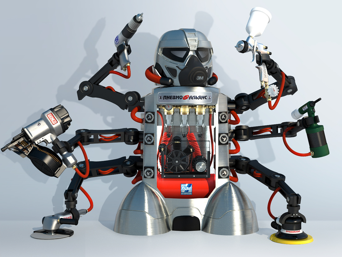 Пневморобокоп от "Мультиграфики"Дизайн-студия "Мультиграфика" создала фирменный персонаж для компании "Пневмо-Альянс", которая занимается поставками пневмо- и электроинструмента на предприятия, а также монтажом производственных пневмолиний.Перед дизайнерами студии была поставлена задача - создать фирменный персонаж, который можно было бы использовать в любой рекламной коммуникации. Главное условие заказчика - "чтобы персонаж был оригинальным и четко отражал сферу деятельности компании". За основу для разработки концепции была взята услуга по укомплектовке пневмолиний. Чтобы уйти от банального изображения линии производства (конвейера) было принято решение представить пневмолинию в виде целостного механизма. Наиболее полно под эту идею подошел робот, как символ комплексной механической системы. Компрессор и шланги робота отражают внутреннее устройство любой пневмолинии, а инструменты, вложенные в руки, показывают ассортимент предлагаемой продукции. Для улучшения качества иллюстрации и придания ей еще большей оригинальности робот был смоделирован в редакторе трехмерной графики. |
