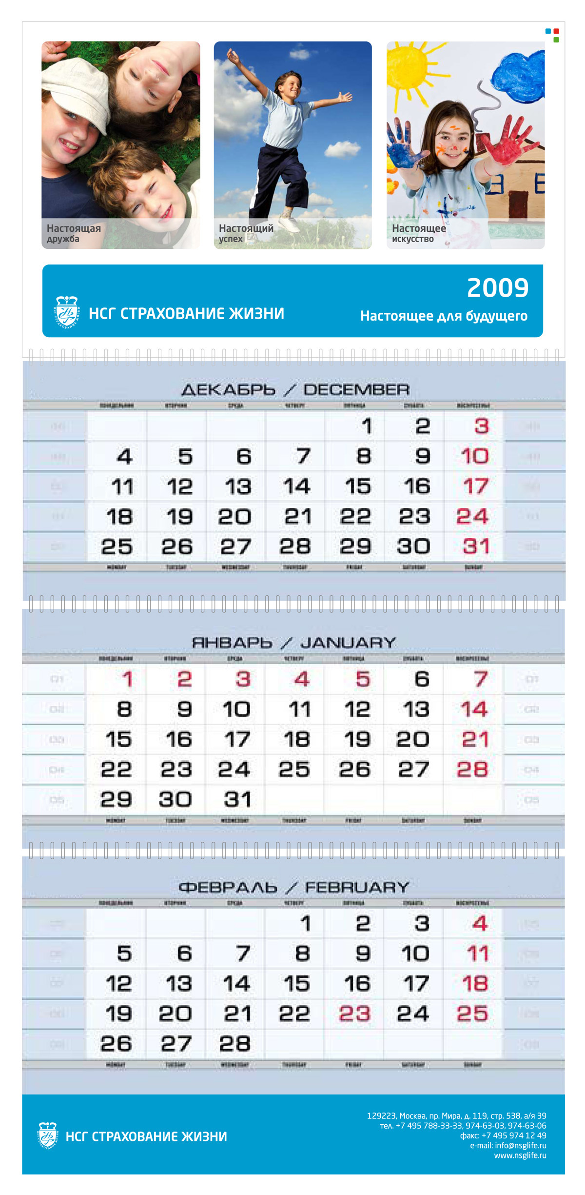 "НСГ Страхование жизни": всё только настоящееДочерняя компания "Национальной страховой группы" "НСГ Страхование жизни" выпустила серию календарей на 2009 год для своих клиентов и партнеров.Идея оформления, разработанная в управлении маркетинга и рекламы "Национальной страховой группы", заключается в визуальном воплощении слогана группы компаний - "Настоящее для будущего". Через визуальный ряд - "Настоящая дружба", "Настоящий успех", "Настоящее искусство" проиллюстрировано понятие "настоящего". Данная концепция позволяет закрепить в сознании клиентов и партнеров слоган "Настоящее для будущего". По словам Президента "НСГ Страхование жизни" Натальи Чумак, "подобный подход в оформлении сувенирной продукции способствует "визуализации" не только слогана, но и самого страхового продукта, как эфемерной единицы". < |