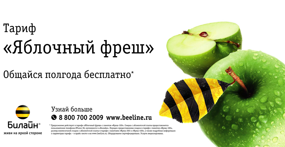 11 декабря стартовала новая рекламная кампания в поддержку тарифного плана "Яблочный фреш". Сроки проведения - декабрь 2008. Слоган: «С новым тарифом "Яблочный фреш" общайся полгода бесплатно». Каналы коммуникации: ТВ, наружная реклама, пресса, ПОСМ.