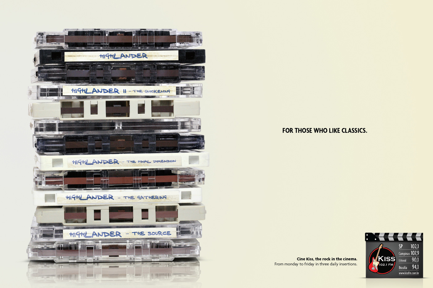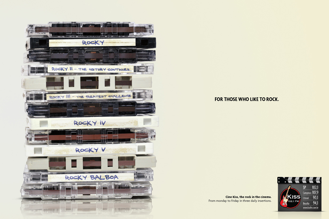 Ваша любимая музыка на волнах Kiss FMС подельника по пятницу, 3 раза в день слушатели бразильской радиостанции Kiss FM могут насладиться отличной музыкой из любимых кинофильмов. Как можно убедиться, глядя на принты от РА Longplay 360, жанровый охват эфира весьма широк, начиная от Rocky (который символизирует rock`n`roll) и, заканчивая Terminator (который выступает в роли хэви металла).Для тех, кто любит хэви металл Для тех, кто любит классику Для тех, кто любит рок Агентство: Longplay 360, Sao Paulo, Brazil Креативный директор: Fernando Luna Арт директор: Eduardo Basque Копирайтер: Wanderley Doro Иллюстратор: Eduardo Gallo |