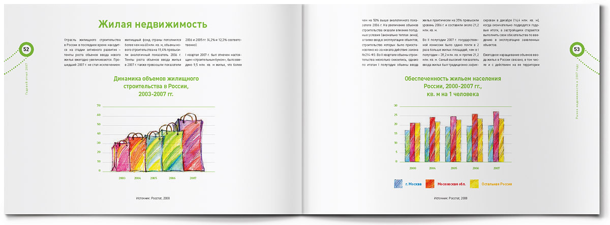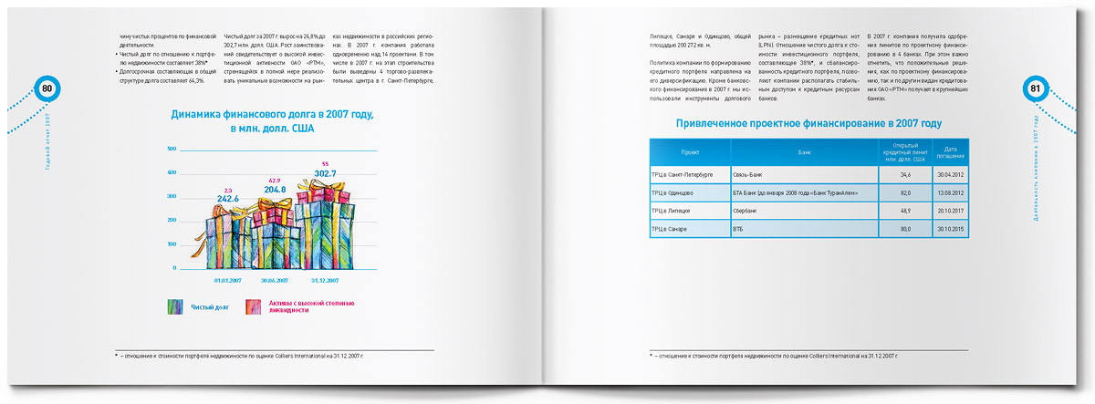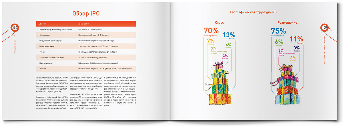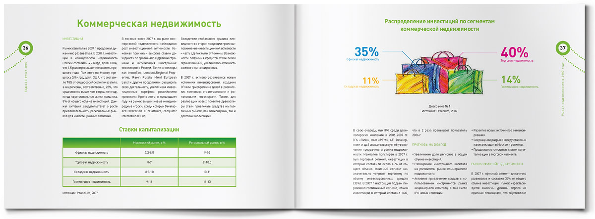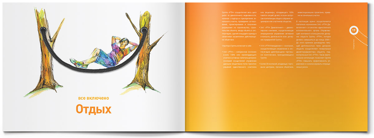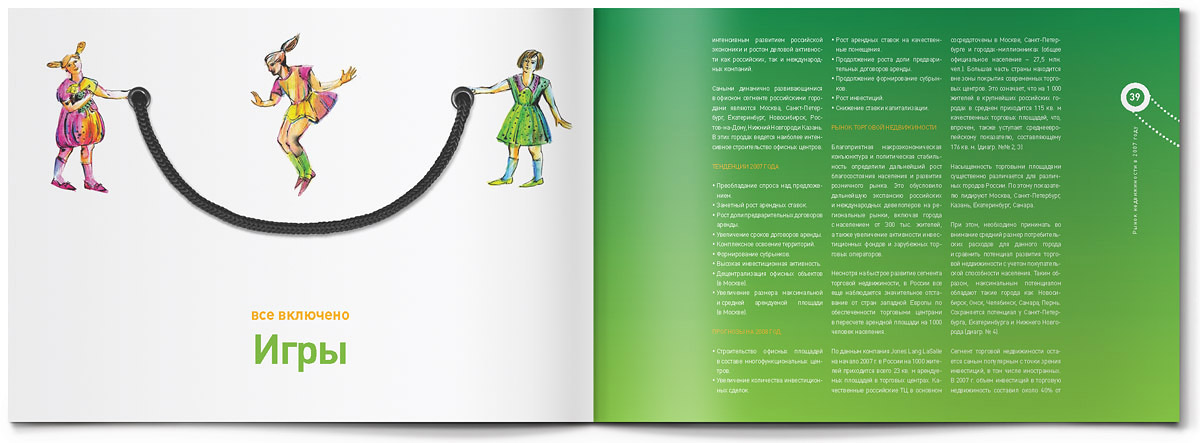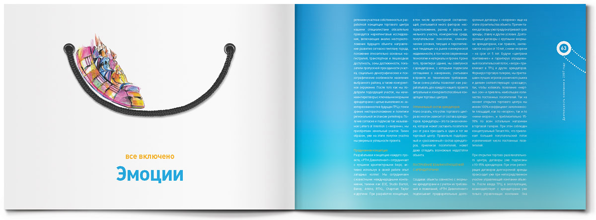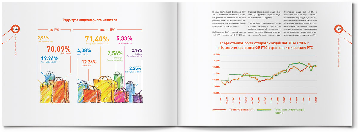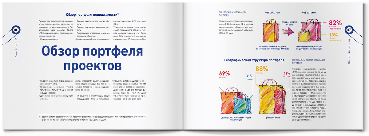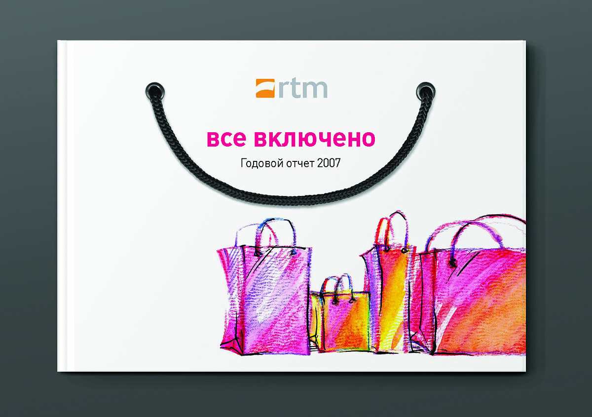 "Жёлтая собака" стилизовала годовой отчет для Группы "РТМ" под пакет для шоппингаЯркий пакет для шоппинга с настоящими веревочными ручками - так внешне выглядит оригинально стилизованный годовой отчет, который дизайн-студия "Желтая собака" выпустила для Группы "РТМ".Основным направлением деятельности этой компании является развитие и управление современными многофункциональными торговыми комплексами. Группа "РТМ" выполняет весь цикл работ по реализации проектов коммерческой недвижимости - от разработки концепции и строительства до управления готовыми проектами. "Идея отчета родилась сразу же, как только мы познакомились с деятельностью компании, - говорит директор студии Станислав Свердлов. - Концепцию мы назвали "All inclusive" ("Всё включено")". Через шмуцтитулы дизайнеры студии попытались показать, с чем ассоциируется у покупателей многофункциональный современный торговый центр, где совершение покупок - далеко не единственное занятие. Это еще и спорт, игры, отдых и, конечно же, сильные яркие эмоции. Оформленные простыми, слегка наивными, но очень жизнерадостными иллюстрациями, шмуцтитулы создают общий позитивный фон всего годового отчета. Созданию настроения служит также яркая цветовая гамма, использованная в оформлении полос, и забавный "смайлик" из веревочной ручки. Основной профиль деятельности компании дизайнеры подчеркнули, составив графики и диаграммы из разнообразных сумочек, пакетов, упаковочных коробок и прочих атрибутов шоппинга. По словам Станислава Свердлова, годовой отчет Группы "РТМ" в целом получился креативным, открытым и очень добрым. И здесь немаловажно то, что в процессе работы позитивным было общение с представителями руководства компании - людьми молодыми, энергичными, готовыми экспериментировать. |