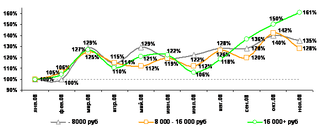 изменения затрат домохозяйств на повседневное домашнее потребление составил 98,2% (-1,8%) к октябрю 2008 года и 139,4 (+39,4%) к ноябрю 2007 года. Аналогичные показатели для предыдущего месяца: +11% и +47,6%. Таким образом, в ноябре рост расходов домохозяйств прекратился. Причем это произошло даже с учетом праздничной недели, на которую пришлось 4 выходных дня. По-видимому, жители российских городов копили ресурсы для больших предновогодних трат, тем более что отдых будет продолжительным, а подавляющее большинство жителей мегаполисов в этот раз, по-видимому, проведут его дома.