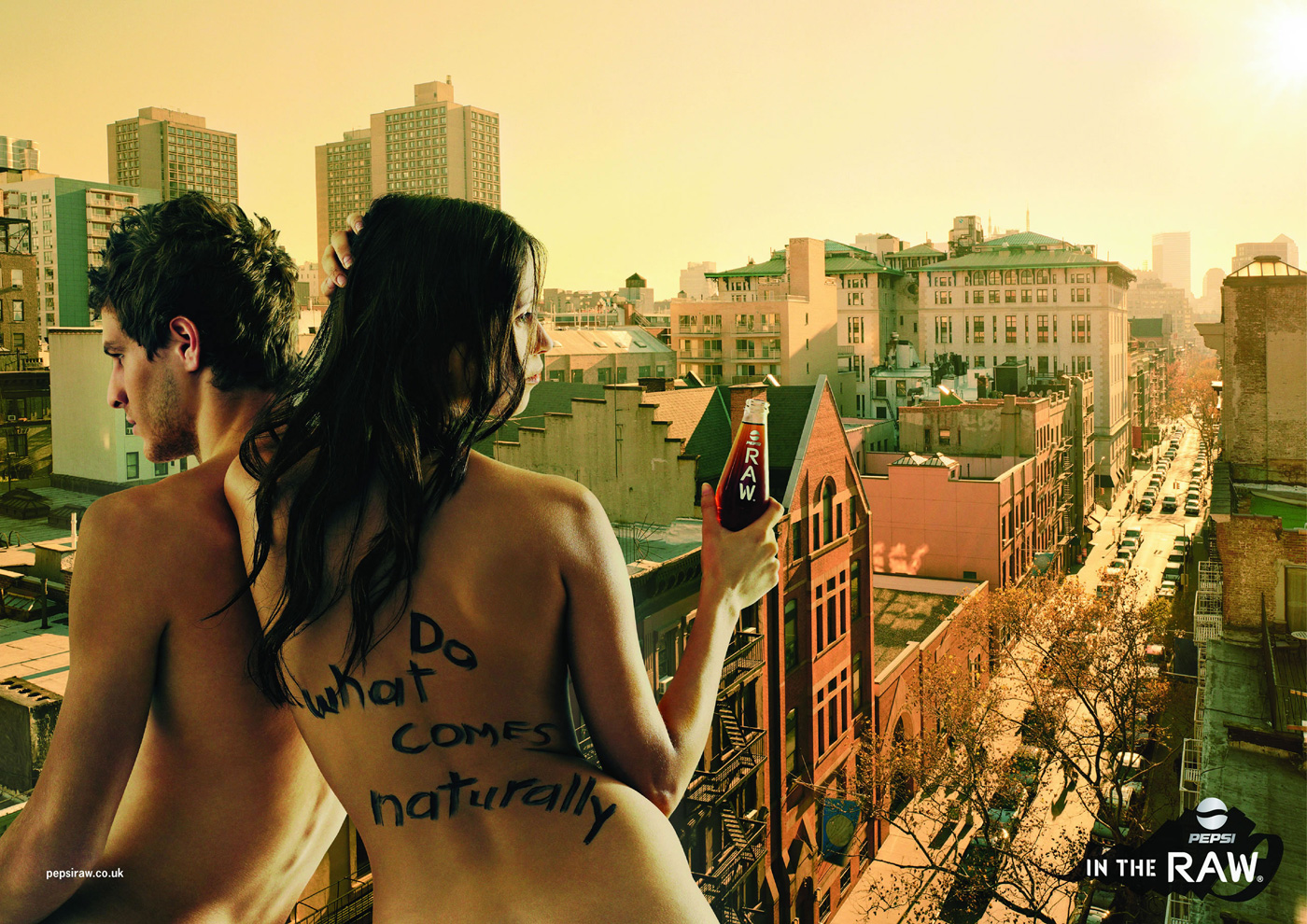 Pepsi Raw призывает ходить голышомНе так давно американская компания PepsiCo добавила в линейку прохладительных напитков Pepsi новый продукт под названием Pepsi Raw. От старой доброй Pepsi этот напиток отличает то, что в его состав не входят никакие искусственные консерванты, красители и подсластители: он создан на основе яблочного экстракта, простого красителя из карамели и кофейных листьев, а также содержит виноградную кислоту, сахарный тростник, акацию и газированную воду. Кроме того, в нем значительно меньше калорий, что выгодно отличает Pepsi Raw от стандартного варианта. Заметим, что многие кампании-производители прохладительных напитков в последнее время стараются обратить свое внимание на производство менее вредных для здоровья напитков, так, австрийская кампания Red Bull GmbH недавно представила нашему вниманию напиток Red Bull Cola, содержащий натуральные ингредиенты, в том числе орех колы и лист коки. Эта рекламная кампания от англичан из креативного агентства Abbott Mead Vickers BBDO, призывает потребителей быть ближе к природе, ходить обнаженными и пить Pepsi Raw.