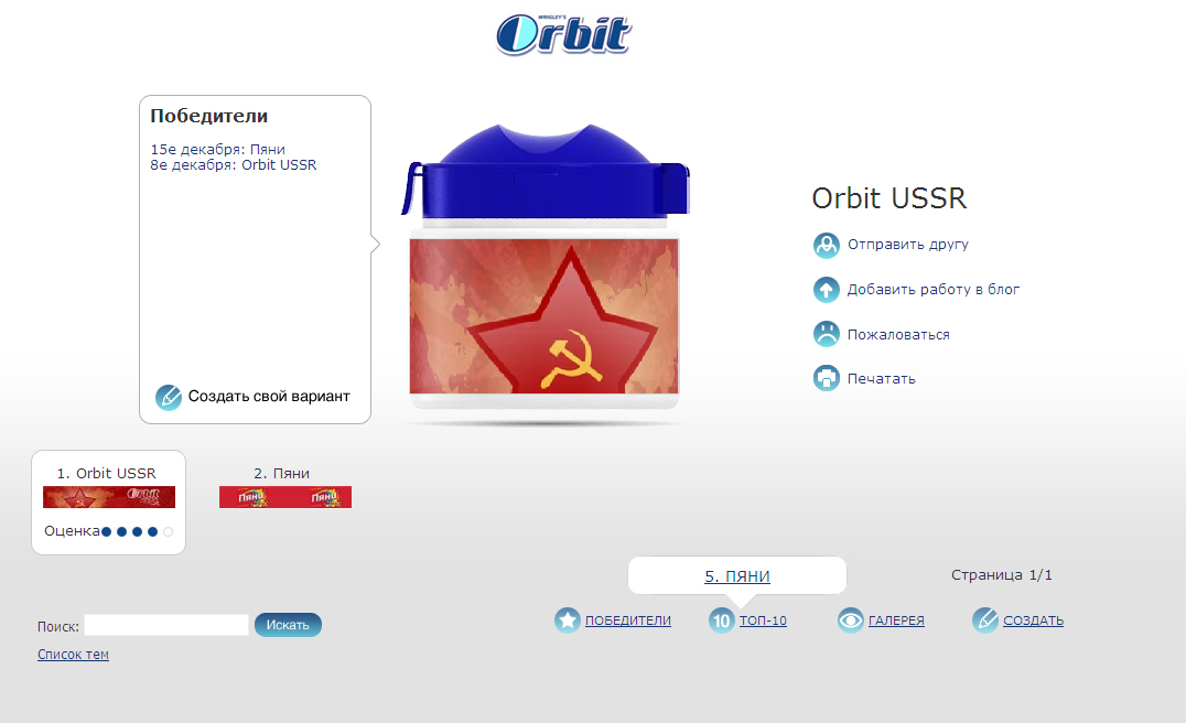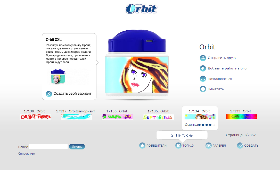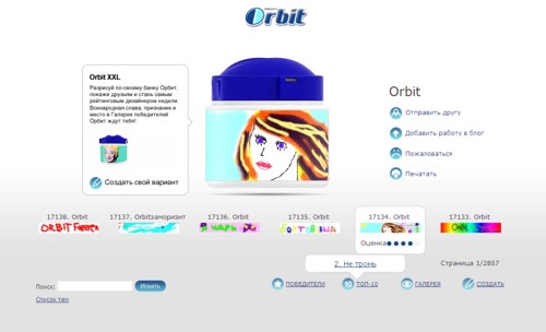 «Орбит» разрешил покупателям раскрасить банки с жевательной резинкой3 декабря стартовала рекламная кампания банок «Орбит» компании Wrigley. Баннерная поддержка проходила на поисковых порталах Yandex и Rambler. Креативную концепцию кампании разработало агентство BBDO Moscow, а реализовало BBDO Interactive. Задача агентства состояла в разработке оригинального интернет-проекта, способного увеличить лояльность к бренду «Орбит» и привлечь внимание целевой аудитории к большим банкам «Орбит», содержащим по 71 драже. Аудитория этой кампании – работающие молодые люди 25-30 лет, которые уже являются потребителями популярной жевательной резинки. Эта категория приверженцев бренда является активными пользователями Интернета. Отправной точкой проекта стало наблюдение, что банка «Орбит», которая у них уже есть или которую они вскоре приобретут, будет постоянно на виду на рабочем месте, дома на кухне или в подстаканнике автомобиля. «Я хотел создать рекламу, дружественную человеку, попадающую под концепцию добровольного маркетинга, — рассказывает копирайтер BBDO Moscow Илья Петров. — Сделать что-то хорошее для потребителя просто так, рассчитывая на положительные эмоции в ответ. Hand-made, user-generated content, web 2.0. Удивительно, как идея получила такое широкое распространение безо всяких дополнительных стимулов: без призов, без обещаний, сама по себе. BBDO Interactive смогло прекрасно реализовать хороший концепт в по-настоящему народный проект». Вот что рассказал креативный директор BBDO Interactive Павел Соловьев о работе над проектом и его результатах: «Идеи ваши, инструменты наши», — заявили мы потребителям весьма любопытным образом. «Орбит» дарит тебе возможность нарисовать на этом баннере все, что ты хочешь»! Фан можно было продолжить на сайте www.naorbite.ru в разделе «Продуктовый отсек». А получившуюся картинку распечатать на цветном принтере и наклеить на свою банку «Орбит». Результат превзошел ожидания в десятки раз: в течение первых трех часов кампании мы получили 20 000 переходов, CTR при этом составлял 3.5%, а значит, просто зашкаливал! А за три недели мы уже имеем около 315 000 человек, прикоснувшихся к прекрасному. И 16 708 работ. Битвы авангардистов, конформистов, ретроградов, интеллектуалов, блондинок, эмо-кидов, воинов упячки. Двух победителей. Массу удовольствия. И это еще только начало!» Состав творческой группы Команда Wrigley: