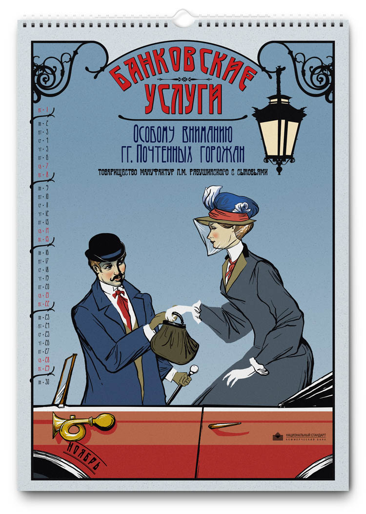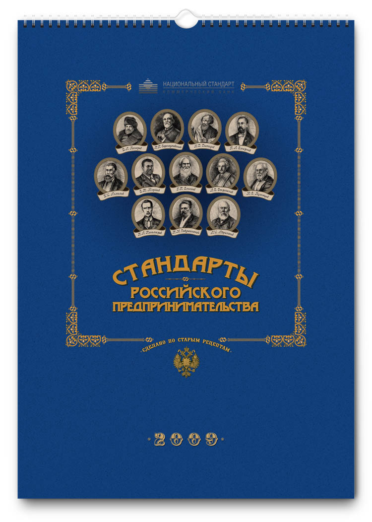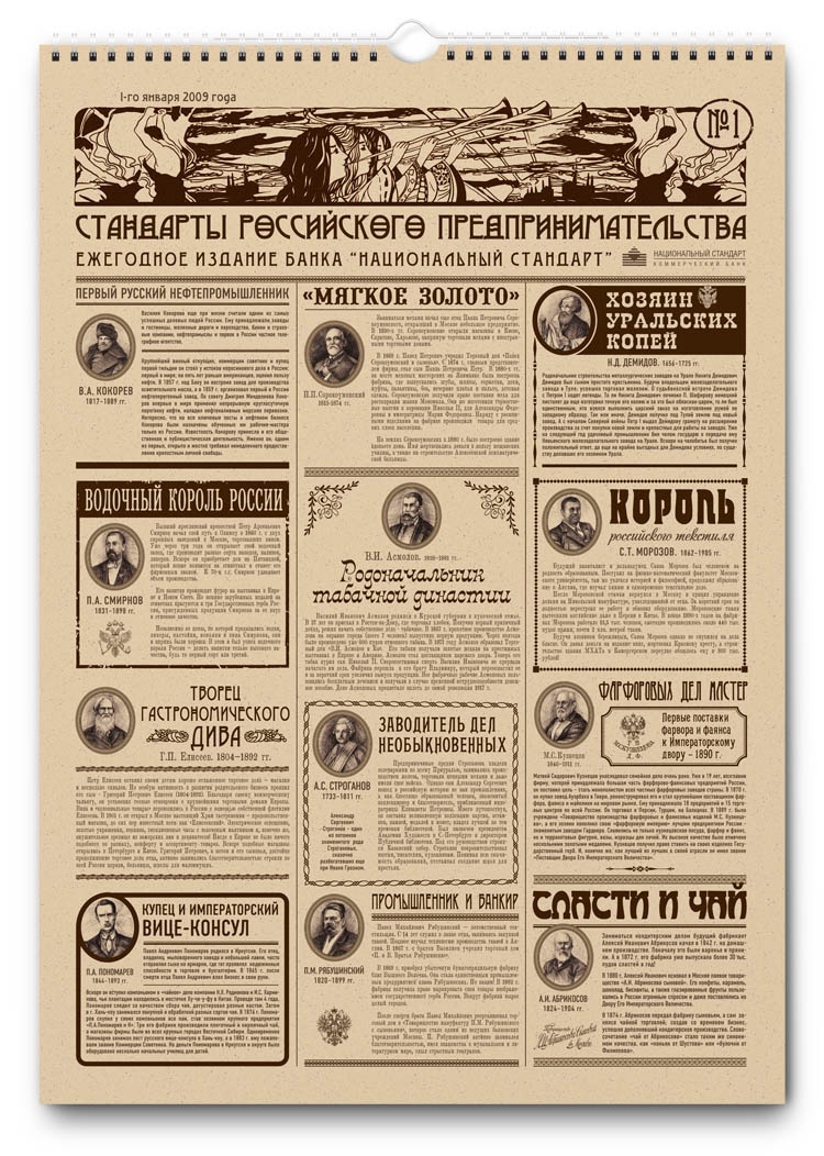 В работе над календарем для банка "Национальный стандарт" "Желтая собака" обратилась к истоками российского предпринимательстваРазрабатывая концепцию календаря на 2009 год для банка "Национальный стандарт", дизайнеры студии "Желтая собака" совершили серьезный экскурс в историю российского предпринимательства. Они решили обратиться к высоким стандартам, по которым строили свое дело знаменитые русские купцы, банкиры и фабриканты, и провести параллель между ними и теми не менее высокими стандартами, которых придерживается сегодня банк "Национальный стандарт". Каждая полоса календаря посвящена деятельности одного из видных предпринимателей дореволюционной России. Здесь представители различных отраслей промышленности, торговли и финансов: Демидов, Рябушинский, Елисеев, Кокорев, Абрикосов, Строганов, Морозов и др. "Продумывая стилизацию календаря, мы попытались представить, как могла бы выглядеть реклама их товаров, изучили множество образцов рекламного творчества дореволюционной России и для каждого из этих славных представителей русского бизнеса создали рекламный плакат", - рассказывает директор студии Станислав Свердлов. Работая над иллюстрациями, иллюстраторы студии постарались максимально соблюсти стилистику и технику рекламного плаката того времени. А чтобы еще и отразить дух эпохи, плакаты дополнили оригинальными текстовыми обращениями. Первую полосу дизайнеры стилизовали под старую газету, "статьи" которой коротко рассказывают о деятельности всех персонажей календаря. По словам Станислава Свердлова, проект, который назвали "Стандарты российского предпринимательства", это не просто очередная работа студии для банка "Национальный стандарт". Это еще и дань уважения талантливым людям, которые стояли у истоков российской промышленности и банковского дела, а также активно занимались благотворительностью и меценатством. |