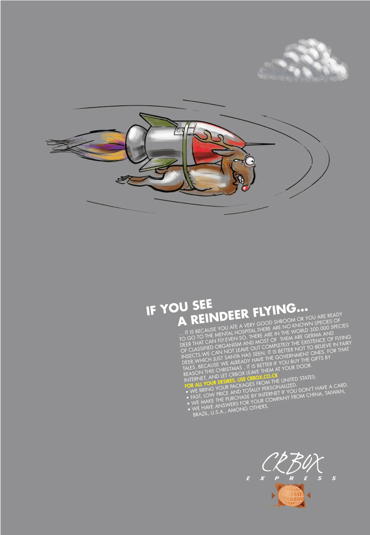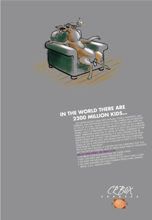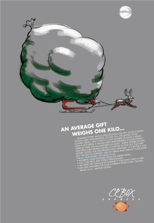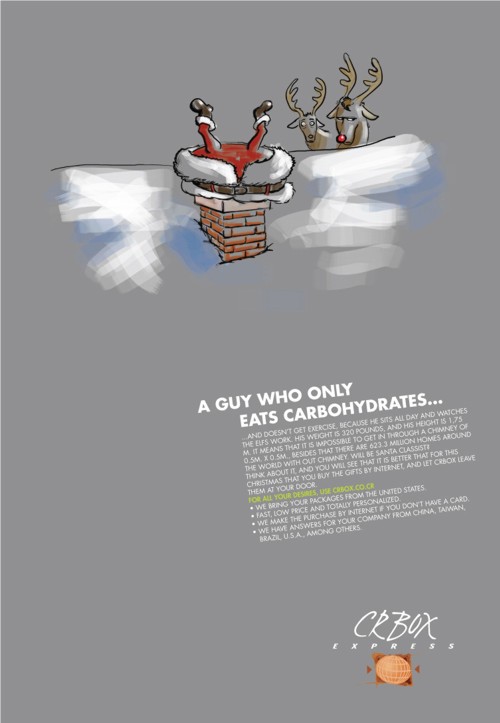 В новой рекламной кампании, созданной коста-риканским агентством La Argolla, ЦА предлагают задуматься о том, как лучше заказывать подарки на Новый год. Каждый принт приводит доводы, говорящие в пользу того, что не всегда стоит доверять доставку подарков Санта-Клаусу, ведь курьерская компания CRBox Express справится с этой ответственной задачей быстрее и лучше. Например, на принте с застрявшим в трубе Санта-Клаусом, креаторы рассказывают о том, что этот сказочный персонаж употребляет слишком много углеводов и совсем не следит за своим весом, а целыми днями сидит и наблюдает за работой эльфов. В итоге при росте в 175 см он весит 320 фунтов (примерно 160 кг), и люди могут остаться из-за этого без подарка. Значительно проще и надежнее заказать подарок через интернет и доверить доставку тому, кто в этом деле профессионал.