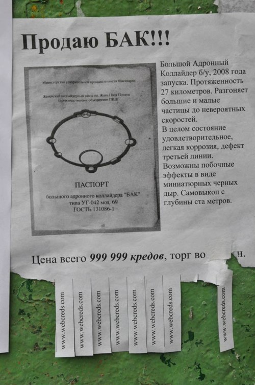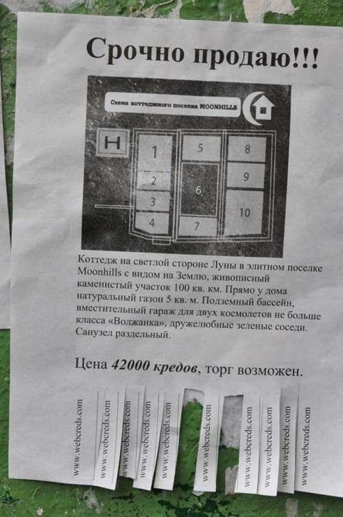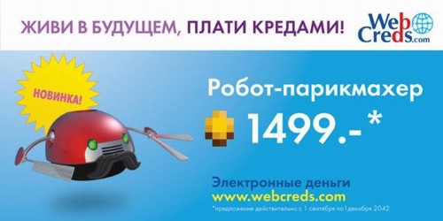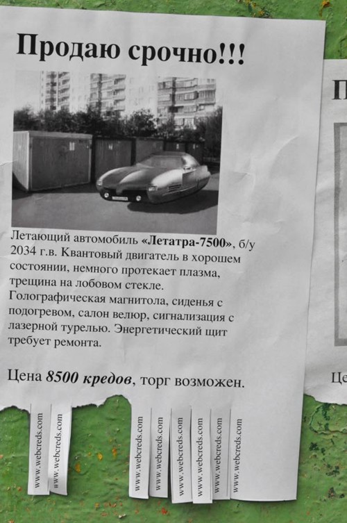 Осенью в Москве можно было увидеть наружную рекламу футуристических предметов"Домашний телепорт", "Робот-парикмахер" и летающий автомобиль "Летатра-9000" продавались как самый обычный ходовой товар вроде чайников или телевизоров. С той лишь разницей, что цена указана в "кредах", а внизу мелким шрифтом написано: "Предложение действительно с 1 октября по 1 декабря 2042 года".В дополнение к outdoor-кампании была проведена широкомасштабная расклейка объявлений. На первый взгляд объявления кажутся совершенно обычными. Но присмотревшись, можно было прочитать, что предлагают они не совсем обычный товар. ![]() Cрочно продаю!!! Коттедж на Луне с видом на Землю на светлой стороне, живописный каменистый участок 100 кв. км. Прямо у дома синтетическая лужайка 5 кв. м. Подземный бассейн, вместительный гараж для двух космолетов не больше класса "Волжанин", дружелюбные зеленые соседи. Санузел раздельный. Цена 42000 кредов, торг возможен. ![]() Продаю БАК!!! Большой Адронный Коллайдер б/у, 2008 года запуска. Протяженность 27 км. Разгоняет большие и малые частицы до невероятных скоростей. В целом состояние удовлетворительное, легкая коррозия, дефект третьей линии. Возможны побочные эффекты в виде миниатюрных черных дыр. Самовыкоп с глубины ста метров. Инструкция на русском прилагается. Цена всего 999 999 кредов, торг возможен. ![]() Продаю срочно!!! Летающий автомобиль "Летатра-7500", б/у 2034 г.в. Квантовый двигатель в хорошем состоянии, немного протекает плазма, трещина на лобовом стекле. Голографическая магнитола, сиденья с подогревом, салон велюр, сигнализация с лазерной турелью. Энергетический щит требует ремонта. Цена 8500 кредов, торг возможен. Несомненно подобные объявления ввели многих прохожих в заблуждение. У людей появилось желание узнать, что же такое "креды" и где купить БАК, Летатру и домик на Луне? ![]() ![]() ![]() ![]() Таким образом о себе заявила новая электронная платежная система WebCreds. Эта рекламная кампания проходила в соответствии с концепцией "Живи в будущем, плати кредами!", позиционирующей электронные деньги WebCreds как валюту будущего, позволяющую не выходя из дома совершать моментальные платежи и денежные переводы. Телефон, интернет, ТВ, билеты в кино, товары в интернет-магазинах и даже услуги ЖКХ можно оплатить через интернет, пройдя быструю процедуру регистрации. Концепция денег будущего и креативный дизайн объявлений были придуманы и воплощены в жизнь Иваном Дергачевым и Иваном Заруцким, победителями двухдневного экспресс-креатива, проведенного ADCR совместно с "РА Вершина". |