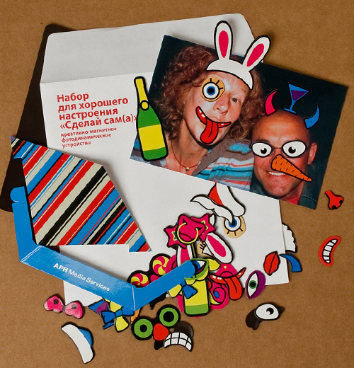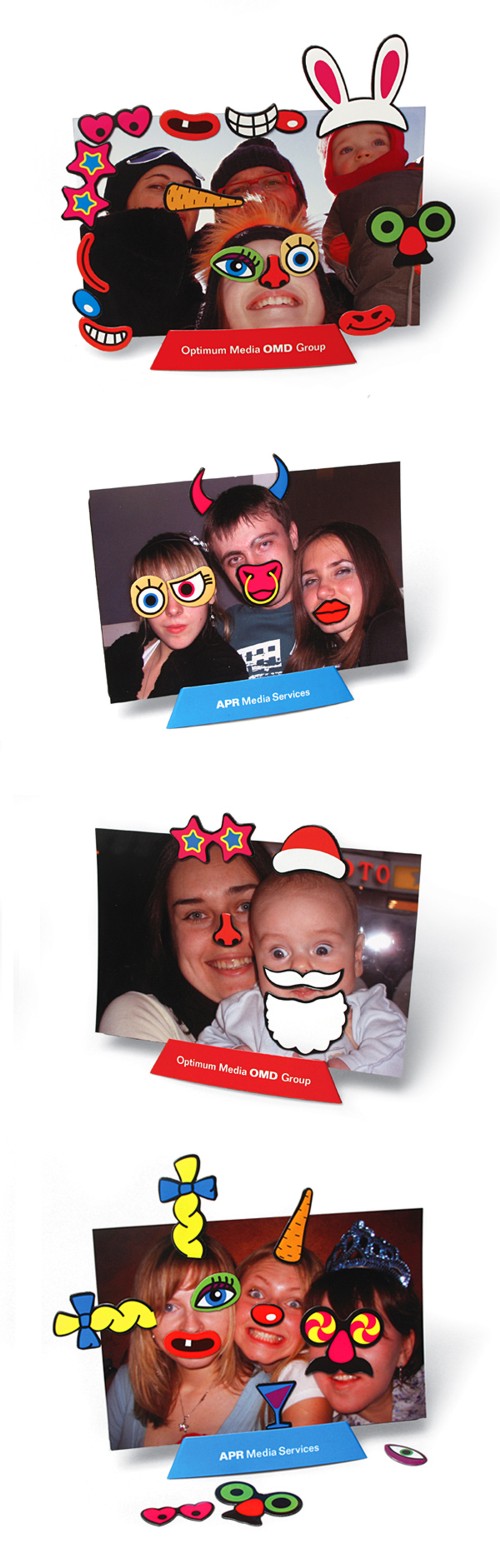 Подарочек от ОМD by ЛОГВИНDESIGNПо заказу Optimum Media OMD Group студия ЛОГВИНDESIGN разработала и организовала серийное производство праздничного визуализатора новогодней реальности.Это устройство может применятся для фэйсмэйкинга, брэндапинга,разноцветного PR или просто для удовольствия. Изготовлено из магнитного пластика и бумаги. Работает на внутренней энергии пользователя. КПД достигает 1100-1200% - тратите несколько минут, а потом куча народа улыбается целый день. Мнения публики по поводу визуализатора разделились. Одни утверждают, что "это дизайн без фотошопа (тм)!", а другие возражают: "нет, это фотошоп (тм) без компьютера!". Состав творческой группы Арт-директор: Андрей Логвин Дизайнер: Константин Глухов Копирайтер: Сергей Логвин