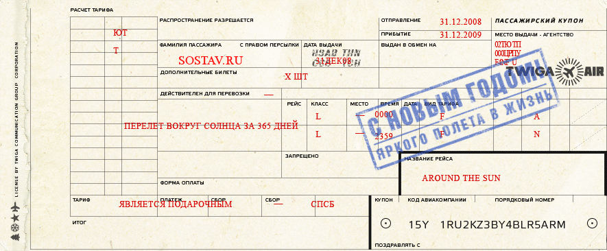 TWIGA дарит всем на Новый Год горячие турыУважаемый Sostav.Ru! От лица TWIGA Communication Group и от себя лично, поздравляю Вас с наступающим Новым Годом и с удовольствием приглашаю отправиться с нами в круиз вокруг Солнца! Вся наша жизнь - это увлекательное и неповторимое путешествие. Ведь каждый год наша планета преодолевает расстояние почти в миллиард километров! Совсем скоро нас ждет очередной красивый и динамичный полет. Ведь в ночь с 31-го декабря на 1-е января отправляется еще один рейс. Нам бы очень хотелось, чтобы именно Вы были с нами в новом году! А чтобы Вам было удобнее принять это приглашение, мы уже выписали Вам билет :=) Будем рады видеть Вас на борту! C наступающим! Успехов и процветания Вам и Вашему проекту в Новом Году! p.s. Вы можете взять с собой в полет друзей http://aroundthesun.twiga.ru/ |