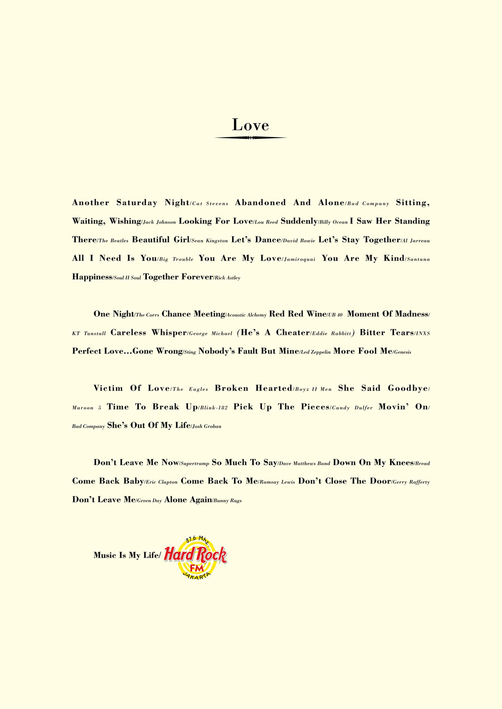 Послание о любви и дружбе от Hard Rock FMРА Advantage Advertising считает, что музыка - лучшая реклама для радиостанции и выпускает кампанию, стилизованную под послания о любви и дружбе, составленные из названий музыкальных композиций авторов, популярных на волнах Hard Rock FM.Музыка - моя жизнь Агентство: Advantage Advertising, Jakarta, Indonesia Копирайтер: Rajesh Menon Арт директор: Wang Zhi Liang |
