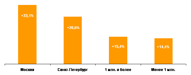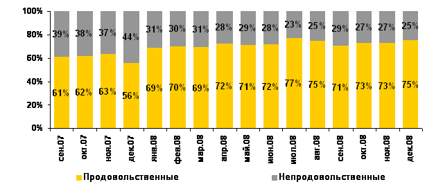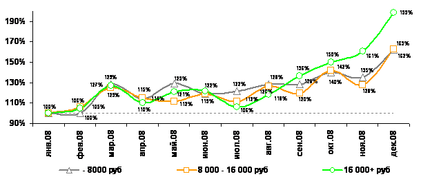 домохозяйств на повседневное домашнее потребление - составил 121,6% (+21,6%) к ноябрю 2008 года и 140,1 (+40,1%) к декабрю 2007 года. Аналогичные показатели для предыдущего месяца: 98,2% (-1,8%) и 139,4 (+39,4%). Столь заметный рост расходов свидетельствует о том, что жители крупных городов не стали экономить на праздниках и провели закупки к ним с привычным размахом. А помогло им в этом сокращение расходов в ноябре.