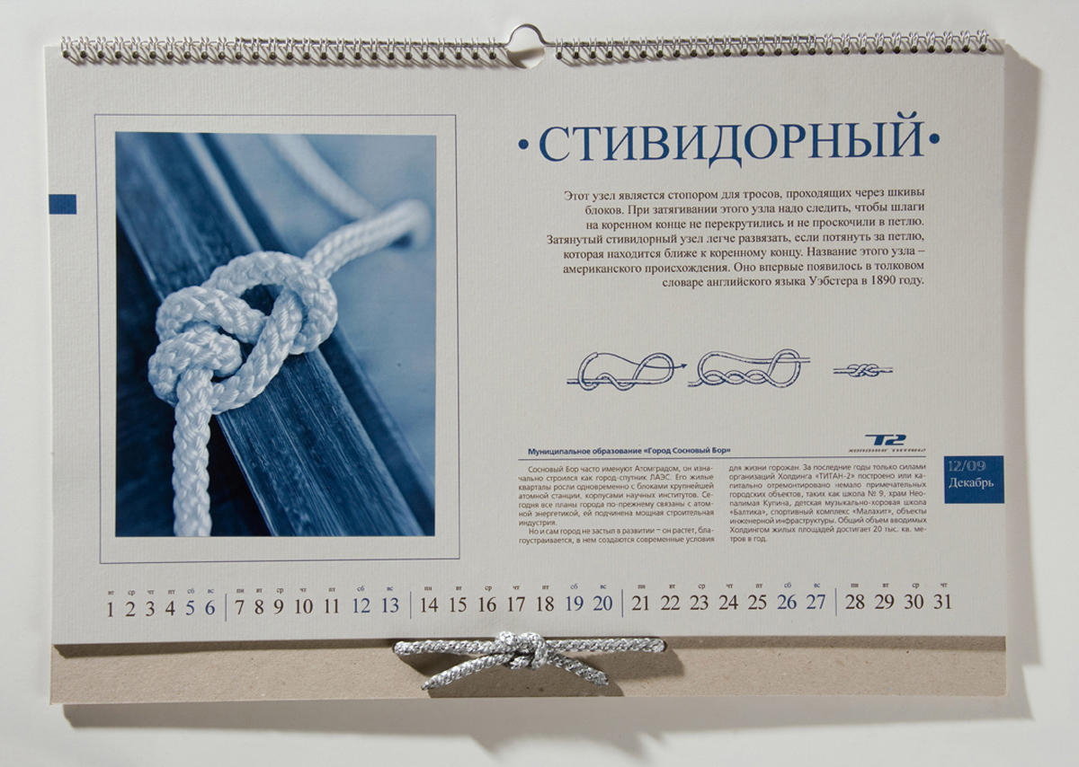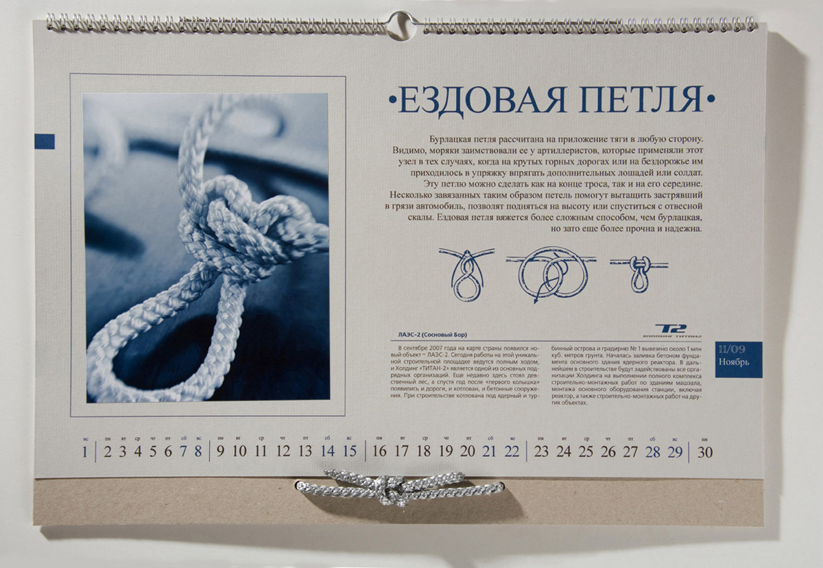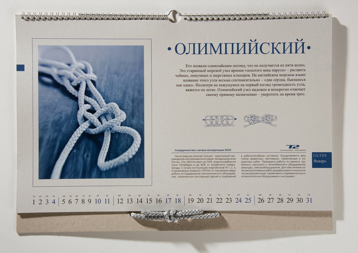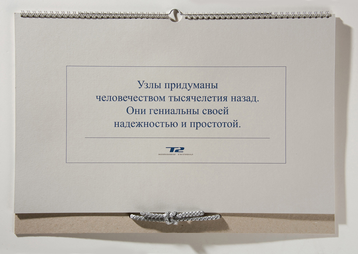Студия DEZA вяжет "Узлы"Узел - совершенно удивительное изобретение человека. Казалось, что может быть банальнее завязанного куска веревки, но за тысячелетия человечество изобрело тысячи же способов завязывания узлов, у каждого из них есть своя история и свое точное предназначение. Узлы с равным успехом служили человеку в глубокой древности и используются по сей день. Главные требования к узлу - его простота и надежность. Они не бросаются в глаза, но от их надежности порой зависит многое. И наконец, узлы просто красивы, как красиво простое и надежное решение.Холдинг "ТИТАН-2" - группа компаний, строящих промышленные объекты атомной отрасли и энергетики "под ключ". Очевидно, что тема узлов возникла вовсе не потому, что компания имеет какое-либо отношение к морскому делу, но тем не менее эта ассоциация удивительно точно подходит ей. Может потому, что выполнение сложных комплексных задач, которыми занимается "ТИТАН-2" складывается из последовательности простых и надежных решений, применяемых, шаг за шагом, будто завязывая очередной прочный и надежный узел. Может потому, что Холдинг объединяет порядка тридцати компаний, они самостоятельны, имеют свою четкую специализацию, а вместе образуют единое неразрывное целое. Возможно потому, что компания дорожит своей историей, отсчитываемой с 1968 года, умело сочетая накопленный опыт и традиции с современными технологиями и новейшими разработками. Календарь приглашает зрителя к спокойному, камерному просмотру, он схож с альбомом. Вы можете неторопливо перелистывать его страницы с наклеенными фотографиями, ощущая фактуру бумаг, совершить краткий экскурс в историю того или иного узла и даже научиться его завязывать, и, конечно, познакомится со значимыми вехами в истории Холдинга. Состав творческой группы Креативный директор: Александр Суворов, Колтынюк Илона Арт-директор: Михаил Дымов, Данил Ярцев Фотограф: Александр Артеменко Сопровождение проекта: Наталья Ядрихинская |