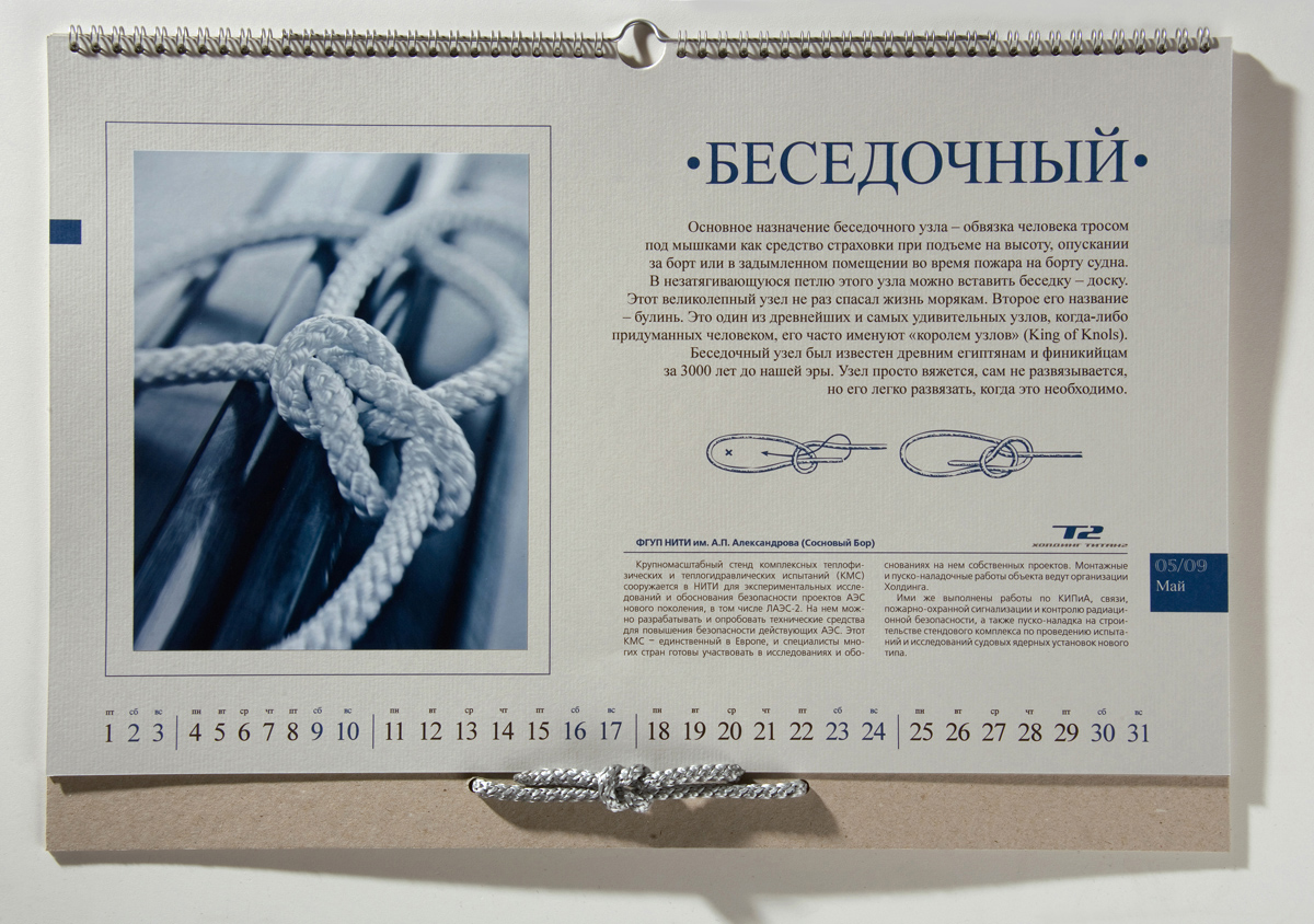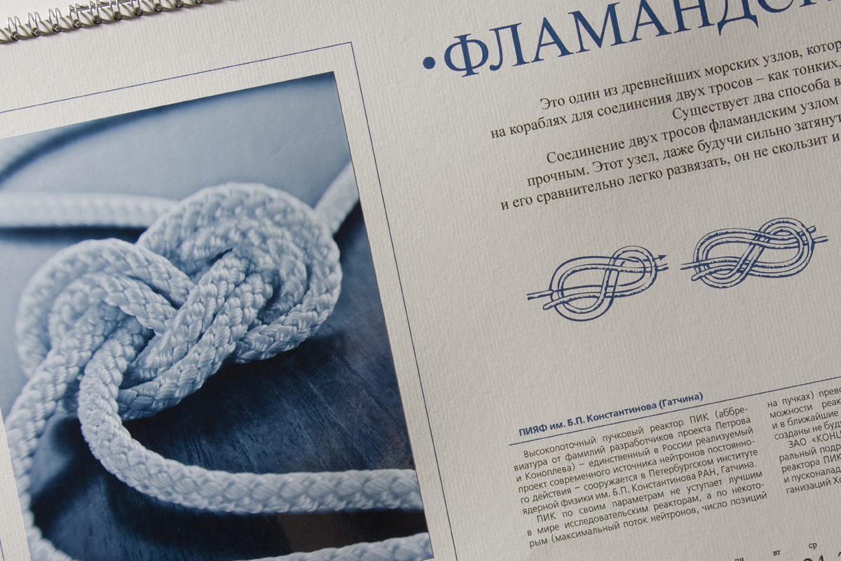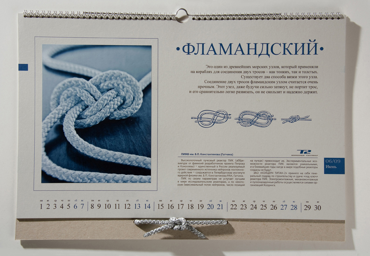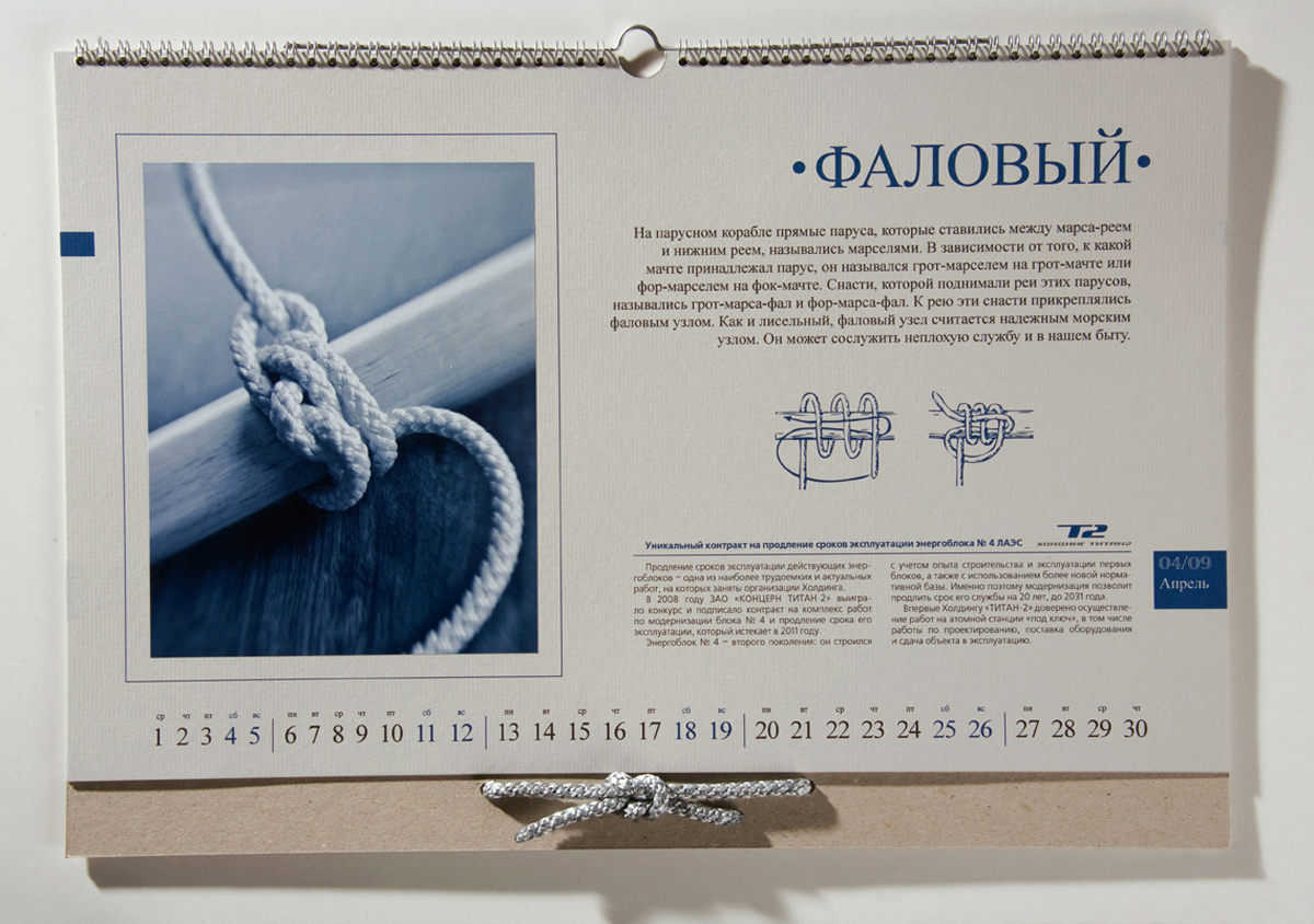 Студия DEZA вяжет "Узлы"Узел - совершенно удивительное изобретение человека. Казалось, что может быть банальнее завязанного куска веревки, но за тысячелетия человечество изобрело тысячи же способов завязывания узлов, у каждого из них есть своя история и свое точное предназначение. Узлы с равным успехом служили человеку в глубокой древности и используются по сей день. Главные требования к узлу - его простота и надежность. Они не бросаются в глаза, но от их надежности порой зависит многое. И наконец, узлы просто красивы, как красиво простое и надежное решение.Холдинг "ТИТАН-2" - группа компаний, строящих промышленные объекты атомной отрасли и энергетики "под ключ". Очевидно, что тема узлов возникла вовсе не потому, что компания имеет какое-либо отношение к морскому делу, но тем не менее эта ассоциация удивительно точно подходит ей. Может потому, что выполнение сложных комплексных задач, которыми занимается "ТИТАН-2" складывается из последовательности простых и надежных решений, применяемых, шаг за шагом, будто завязывая очередной прочный и надежный узел. Может потому, что Холдинг объединяет порядка тридцати компаний, они самостоятельны, имеют свою четкую специализацию, а вместе образуют единое неразрывное целое. Возможно потому, что компания дорожит своей историей, отсчитываемой с 1968 года, умело сочетая накопленный опыт и традиции с современными технологиями и новейшими разработками. Календарь приглашает зрителя к спокойному, камерному просмотру, он схож с альбомом. Вы можете неторопливо перелистывать его страницы с наклеенными фотографиями, ощущая фактуру бумаг, совершить краткий экскурс в историю того или иного узла и даже научиться его завязывать, и, конечно, познакомится со значимыми вехами в истории Холдинга. Состав творческой группы Креативный директор: Александр Суворов, Колтынюк Илона Арт-директор: Михаил Дымов, Данил Ярцев Фотограф: Александр Артеменко Сопровождение проекта: Наталья Ядрихинская |
