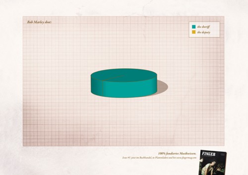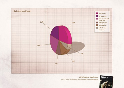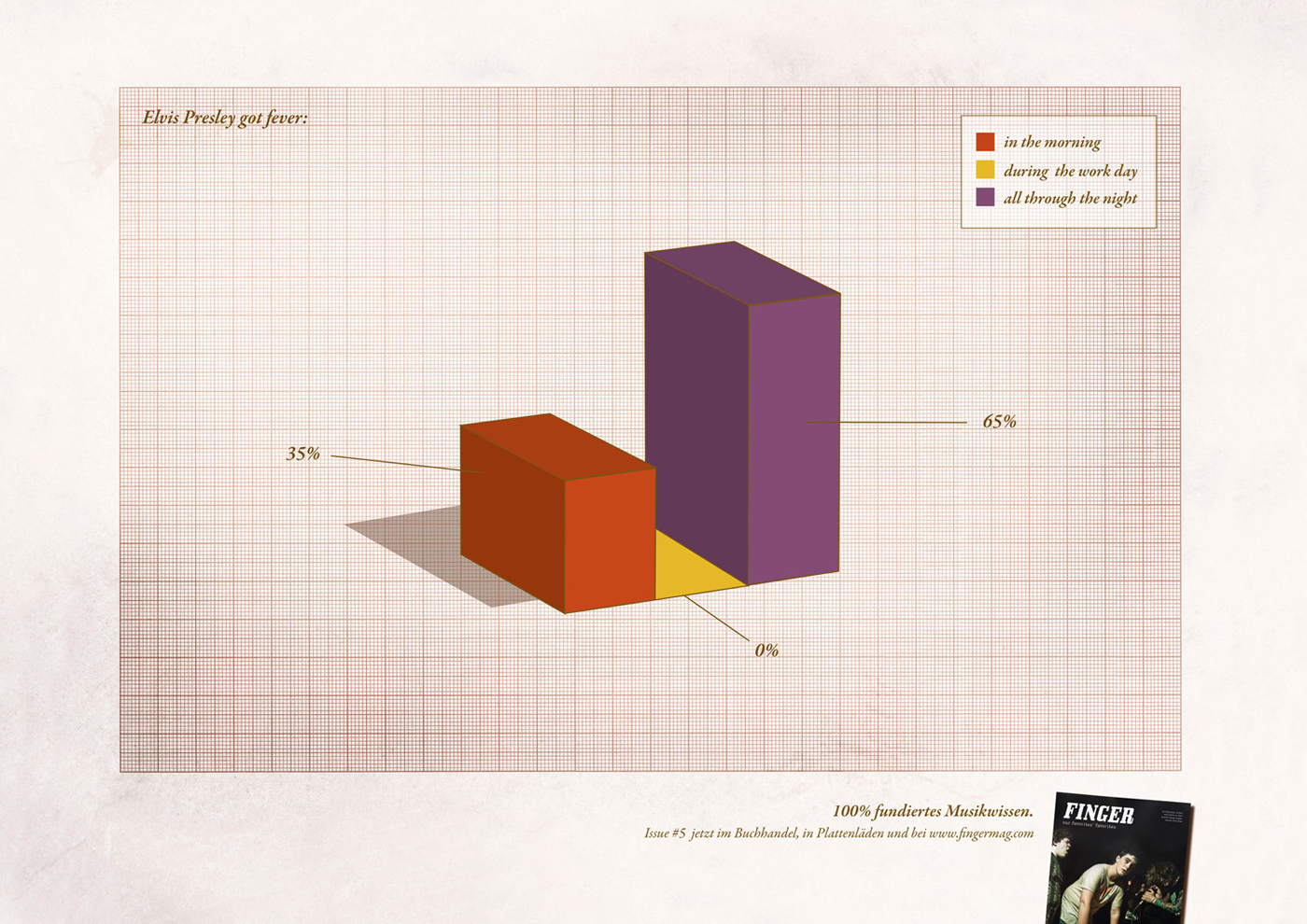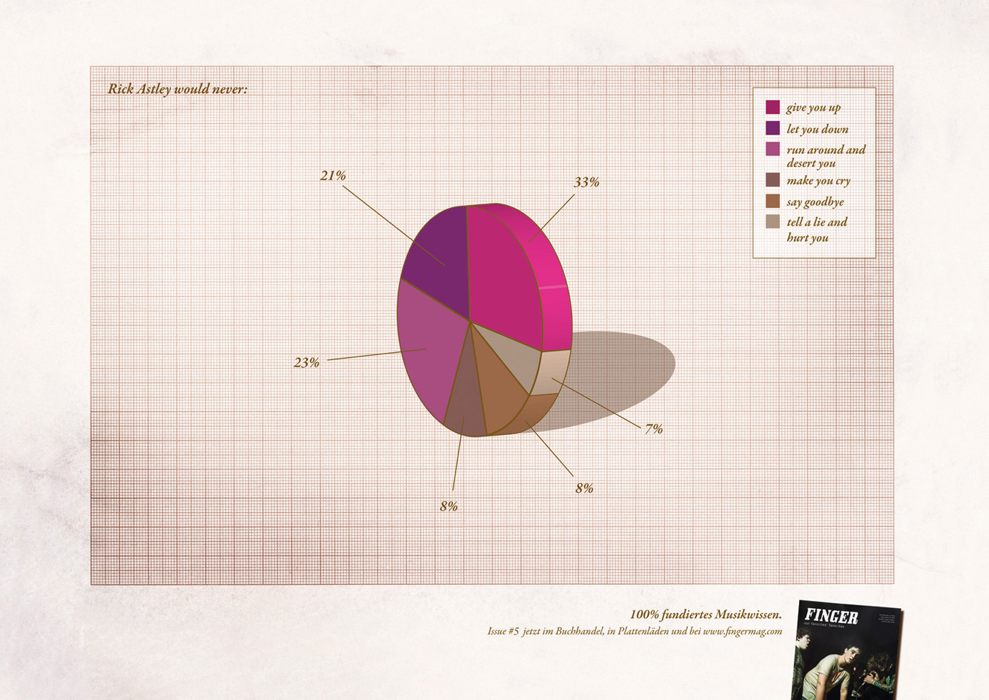 Научный подход к музыке от журнала FingerУ каждой песни есть ключевые слова или припев, по которому слушатель сразу узнает, что за композиция играет. Для того чтобы проиллюстрировать это утверждение, агентство KSB/SJ задало вопрос, состоящий кусков известных песен. Ответ проиллюстрирован в виде диаграмм.Музыка, узнаваемая на 100% Агентство: KSB/SJ, Zurich, Switzerland Арт директора: Charles Blunier, Andrea Heierli Копирайтер: Adrian Hoenicke |