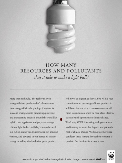 Лампочка как первый шаг к спасению нашей планетыВ новой кампании, направленной против изменений в климате, WWF и DraftFCB акцентируют внимание общественности на том, что одних "зеленых" товаров не достаточно. Для борьбы с изменением климата требует переоснащение производства, коммуникаций, транспорта, складов и тд. Несмотря на то, что все эти изменения дело далекой перспектив, WWF рекомендует потребителям принимать участие в спасении нашей планеты уже сейчас.Сколько ресурсов и загрязняющих природу веществ требует для того, чтобы сделать лампочку? Агентство: DraftFCB, Toronto, Canada Креативные директора: Robin Heisey, Joe Piccolo, Chris Taciuk Арт директора: Joe Piccolo, Oliver Brooks Копирайтеры: Chris Taciuk, Mike Richardson |