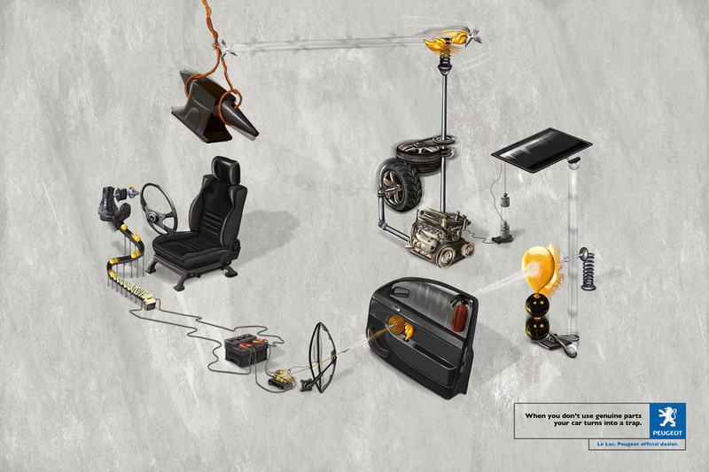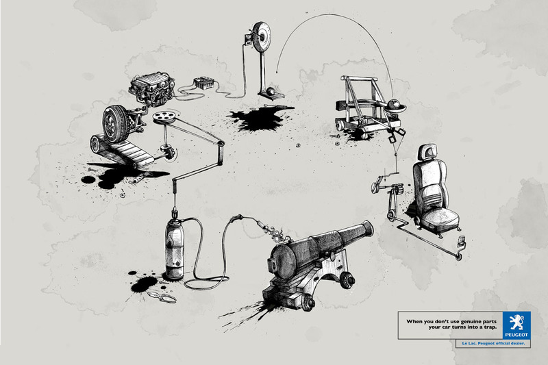 Peugeot рекомендует использовать только оригинальные запчастиБразильские креаторы из РА Artplan по просьбе автомобильного дилера Le Lac Peugeot Dealer предостерегают экономных и беспечных водителей: не стоит гнаться за дешевизной и использовать в своем автомобиле неоригинальные запчасти. Дело в том, что такие детали могут сослужить плохую службу, превратив авто в смертельную ловушку, готовую сработать в любой момент.Слоган: "Когда ты не используешь оригинальные запчасти, твой автомобиль превращается в ловушку." Агентство: Artplan, Бразилия Творческий директор: Roberto Vilhena Арт-директор: Tico Moraes, Bernardo Romero Копирайтер: ROberto Vilhena Иллюстратор: Alessandro Cerqueira, Marcelo Zissu, Otavio Rios |
