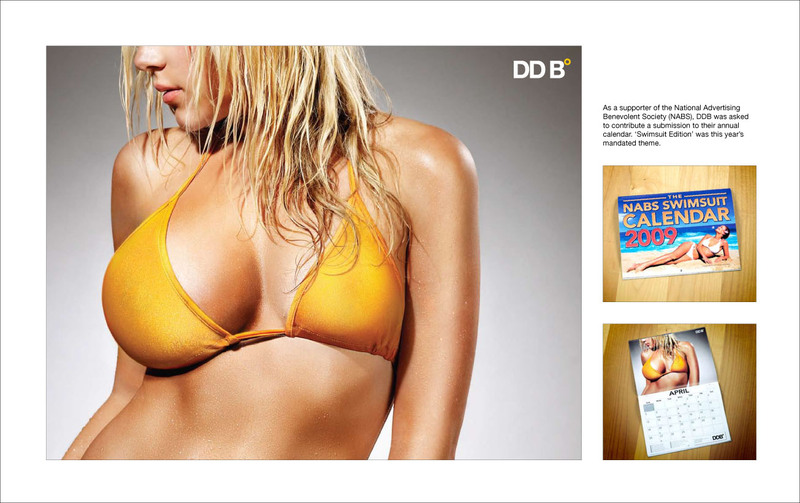 DDB рекламирует себя с помощью женской грудиNational Advertising Benevolent Society (NABS) - единственная в Канаде организация, которая осуществляет помощь специалистам занятым в сфере рекламного бизнеса, СМИ и смежного бизнеса, которым из-за болезни, травм, увольнения или финансовых трудностей требуется помощь. В качестве помощи выступает финансовая помощь, переквалификация, трудоустройство и т.д.Агентству DDB было поручено внести свой вклад в создание ежегодного календаря. Одну из страниц 'Swimsuit Edition' украсила девушка с разным размером груди (двойной D (DD) и B), который, если читать слева на право, складывается в название агентства. Агентство: DDB Vancouver Исполнительный креативный директор: Alan Russell Креативный директор: Dean Lee/Cosmo Campbell Арт директор: Chris Moore Копирайтер: Jarrod Banadyga Фотограф: Philip Jarmain РЕтушь: The Orange Apple |