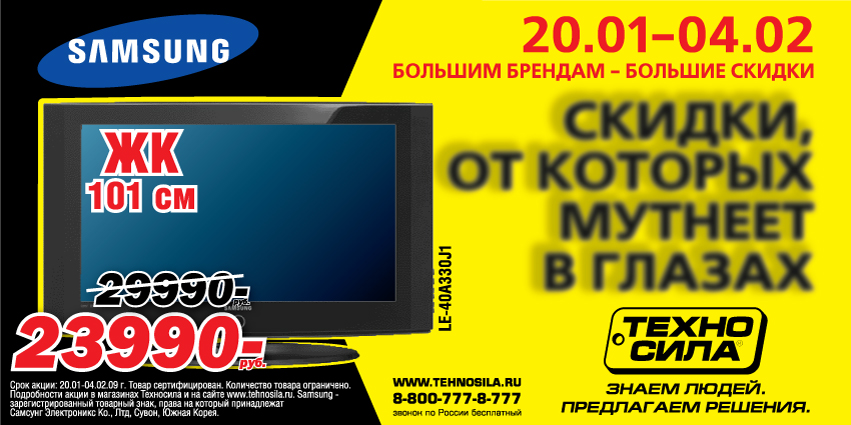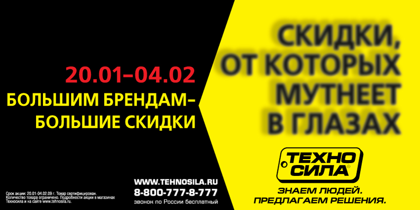 У "Техносилы" помутилось в глазах20 января в сети "Техносила" стартует новая акция "Большим брендам - большие скидки". Она продлится до 4 февраля 2009 года.Рекламная кампания со слоганом "Скидки, от которых мутнеет в глазах" является продолжением единой концепции внешних коммуникаций сети "Техносила" "Знаем людей, предлагаем решения". В рамках кампании предусмотрена реклама на федеральных ТВ-каналах, наружная реклама и собственный глянцевый рекламный каталог с конкретными ценовыми предложениями. В рамках акции будут значительно снижены цены на большой ассортимент товаров по всем товарным группам. Кроме того, будет производиться прием скидочных купонов, которые выдавались во всех магазинах сети "Техносила" в период с 16 декабря 2008 по 18 января 2009 года. "Январь традиционно является сезоном пониженной активности на рынке бытовой техники, и данная рекламная кампания призвана поддержать интерес потребителей. Одновременно мы предоставляем им возможность сделать выгодные покупки и с пользой вложить деньги в качественную технику. Мы уверены, что в период кризиса такой подход еще больше укрепит лояльность существующих покупателей и привлечет новых",- сказал вице-президент по стратегическому развитию сети "Техносила" Леонид Тюкавкин. |
