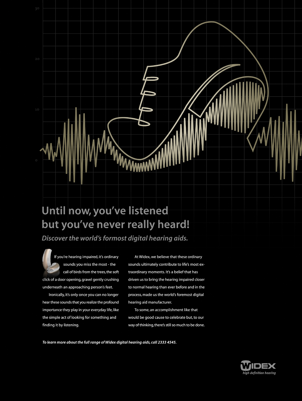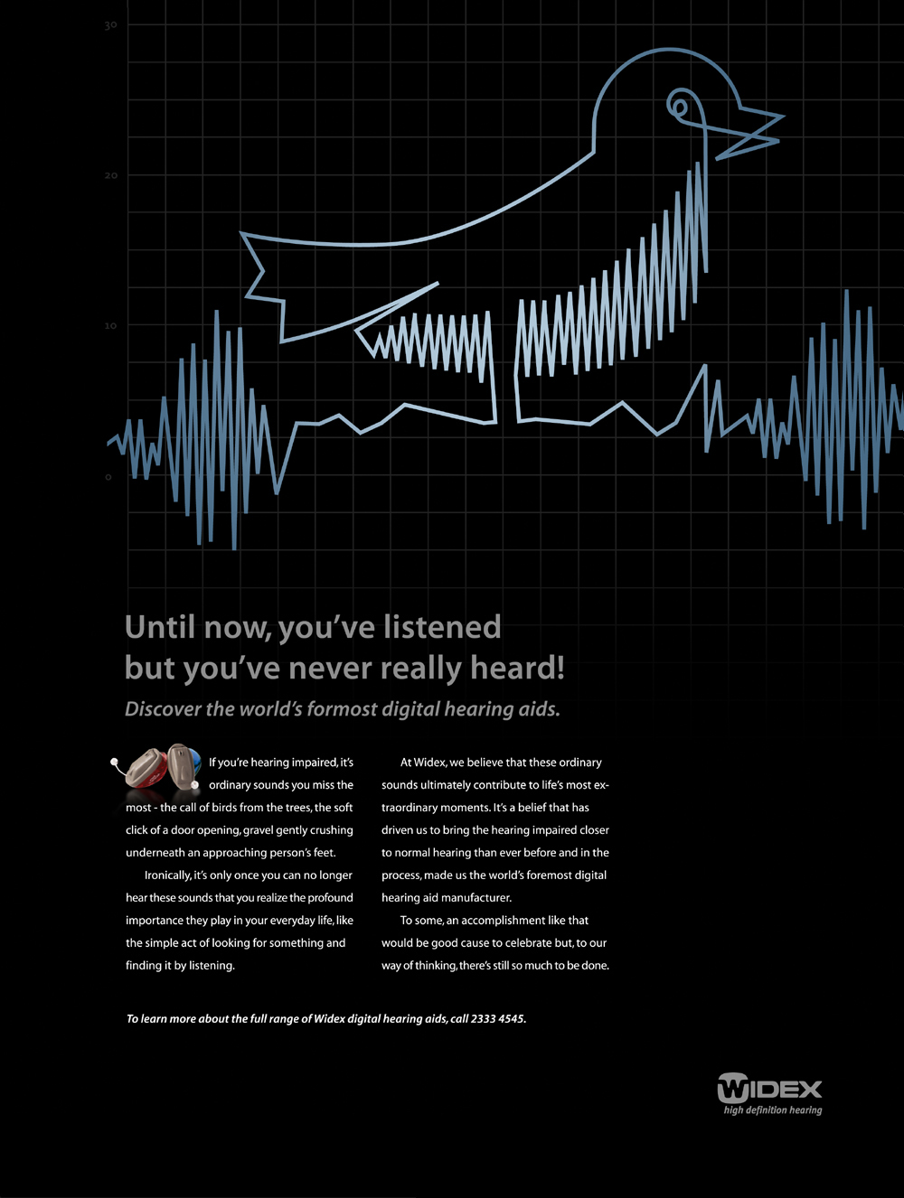 Мир обретет звук благодаря WidexКомпания Widex ("Видэкс") входит в десятку крупнейших производителей цифровых слуховых аппаратов, а ее история существования начинается с 1956 года. Российское представительство этой фирмы официально основалось в 2005 году, хотя ее продукция появилась в стране еще в 1997 году.Эти рекламные принты подготовило для компании Widex мальтийское агентство Bulldog. Большую их часть занимает текст, рассказывающий о достоинствах слуховых препаратов этого производителя, о том, что люди с ослабленным слухом могут не слышать таких повседневных вещей, как пение птиц на деревьях, звук открывающейся двери или шелест гравия под ногами ботинок. Слоган: "До сих пор вы слушали, но никогда не слышали. Откройте для себя мир цифровых слуховых аппаратов." Агентство: Bulldog, Lija, Мальта Творческий директор / Арт-директор / Копирайтер / Иллюстратор: Ren Spiteri |
