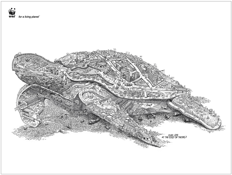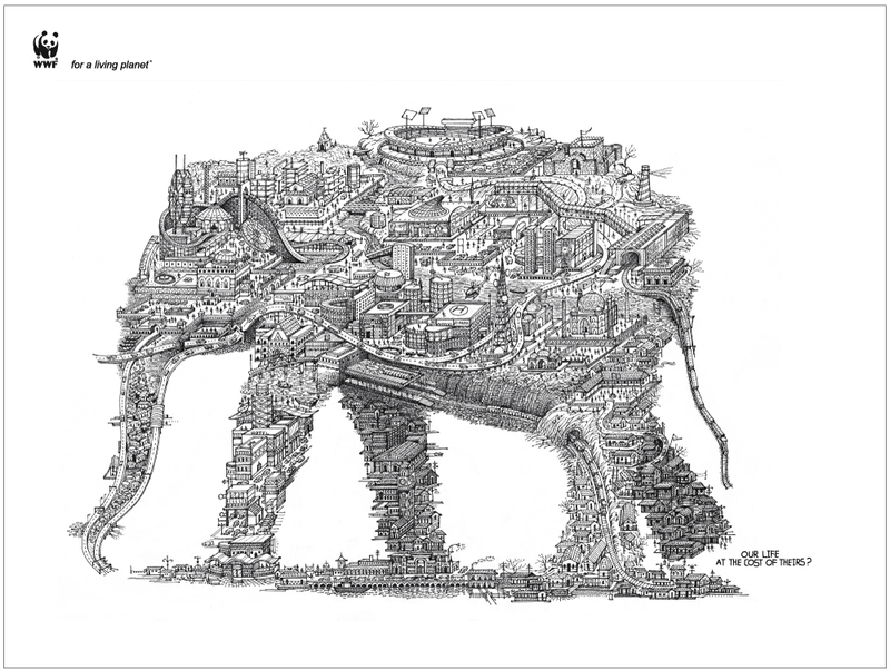 WWF рассказывает, чего стоит человеческий прогрессЭто очередная работа индийского отделения рекламного агентства Ogilvy & Mather для всемирно известной общественной организации WWF (Всемирный фонд дикой природы). Ранее креаторы рассказывали о пользе деревьев, изобразив их в виде различных представителей фауны. Сегодня индийские специалисты составили слона, черепаху и носорога из предметов, созданных руками человека, проиллюстрировав таким образом следующую мысль: человеческий прогресс и техническое развитие отбирает жизни у огромного количества животных...Слоган: «Наша жизнь по цене их жизни?» Агентство: Ogilvy& Mather, Мумбай, Индия Главный творческий директор: Piyush pandey Творческий директор: Sumanto chattopadhyay Арт-директор: Mandar wairkar, Mayur varma Копирайтер: Sumanto chattopadhyay, Karn singh, Mandar wairkar Иллюстратор: Swapnil nilkanth |