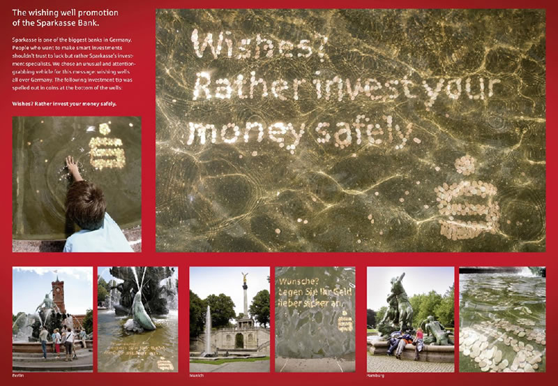 Банк Sparkasse строит рекламную кампанию на приметеРусские кидают монетки в фонтаны, реки и другие водоемы, чтобы в будущем вернуться туда, а немцы производят эти же простые манипуляции с наличностью, чтобы загадать желание.Креаторы из берлинского рекламного агентства Jung von Matt Berlin очень удачно использовали это поверье, чтобы донести до ЦА следующую мысль: лучше положить деньги в банк Sparkasse, вместо того чтобы просто так выбрасывать их в воду. Для этого внутри одного из фонтанов Берлина с помощью мелочи было выложено рекламное сообщение: "Загадываешь желания? Лучше надежно вложи свои деньги". Агентство: Jung von Matt Berlin, Германия |