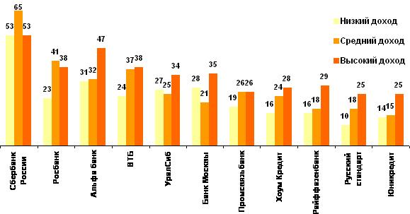 Результаты опроса показали, что среди представителей низкодоходной группы рассмотренные банки имеют индексы репутации ниже, чем в целом по России. Исключение составляет Банк Москвы, который занял более высокую позицию в данной группе и имеет индекс 28, что на 3 пункта выше, чем в среднем по выборке. Два первых места в низкодоходной группе заняли Сбербанк и Альфа-банк, их индексы составили 53 и 31 соответственно.