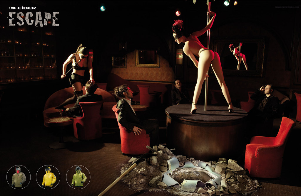 EIDER: побег из стриптиз-бара"Побег", - под таким заголовком агентство Nogoodindustry проводит рекламную кампанию EIDER, одежды для экстремального отдыха и спорта. Принты показывают картины обыденности, от которых бегут в горы любители адреналина. Но для того, чтобы "побег" увенчался успехом, необходима важная деталь - экипировка компании EIDER.Побег Агентство: Nogoodindustry Клиент: EIDER/Mountain equipment Исполнительный креативный директор: Julia Hilmer Креативный директор: Julia Hilmer Арт директор: David Ariyel Копирайтер: Mario Eymieux Фотограф: Arno Pyvka |