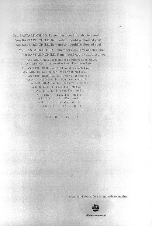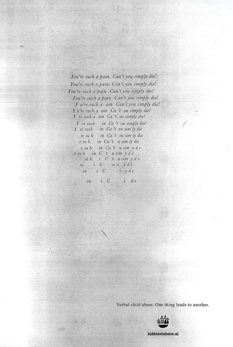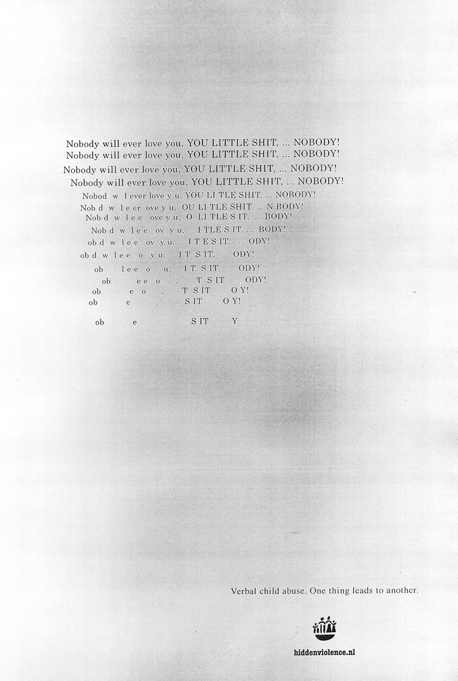 Не ругайте детей, если не хотите, чтобы из них выросли наркоманыСоциальная рекламная кампания для hiddenviolence.nl от агентства Saatchi & Saatchi показывает зрителю, какой сокрушающий эффект на психику ребенка производит словесное насилие. Принты организации, выступающей против насилия в семье, раскрывают истоки суицидальных наклонностей, тяги к наркотическим препаратам и дальнейшей зависимость от них, ожирения, нервозов. Все это - причина морального насилия, которому ребенок подвергся в детстве.Слоган: Словесное насилие над детьми. Одно ведет к другому. Агентство: Saatchi & Saatchi, Amsterdam, The Netherlands Креативный директор: Magnus Olsson Арт директора: Tim Bishop, Avinash Sampath Ретушь: Jeroen Wartenbergh Копирайтеры: Avinash Sampath, Tim Bishop |