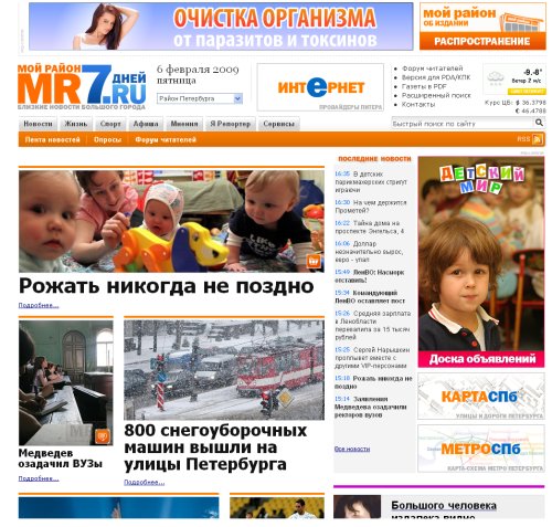 Сетевой «Мой район» перешел на семидневкуГазета «Мой район» запускает 7 февраля новый информационно-новостной интернет-портал. Ресурс будет предоставлять в режиме on-line семь дней в неделю последние новости города, страны и мира. По словам представителей издательства, новый портал станет продолжением развития сайта газеты «Мой район». Как рассказал Adlife.spb.ru руководитель проекта mr7.ru Сергей Базанов, проект развивался в течение нескольких лет. Во время появления бумажной газеты в Сети появилась ее рекламная страница, на которую выкладывались только заголовки публикаций. В 2006 году стали публиковаться статьи и она стала газетным сайтом. В 2008 году было решено сделать ее полноценным новостным ресурсом с ежедневным обновлением информации. По словам Сергея Базунова, над контентом работает специально созданная web-редакция, которая будет взаимодействовать с сотрудниками бумажной версии газеты: все газетные публикации будут размещены в первую очередь на сайте, и самые интересные материалы с сайта пойдут в печать.
