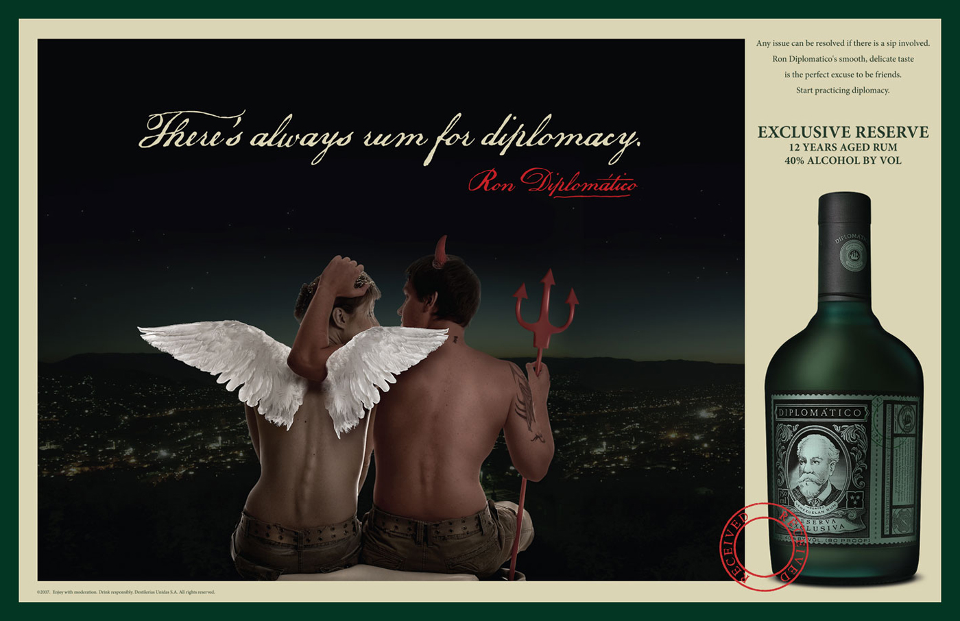 Ром Ron Diplomatico примирит даже Горбачева и РейганаРом с говорящим названием Ron Diplomatico, уверены креаторов из американского рекламного агентства Brainswitch Advertising Miami, способен примерить самых непримиримых противников таких, как, например, черта и ангела, Михаила Горбачева и Рональда Рейгана или даже игроков разных футбольных команд. Принты призывают попробовать ром Ron Diplomatico и заняться дипломатией.Слоган: "Всегда есть ром для дипломатии. Любую проблему можно решить с помощью небольшого глотка. Мягкий, тонкий вкус Ron Diplomatico - прекрасный повод стать друзьями. Начните практиковаться в дипломатии". Состав творческой группы: Агентство: Brainswitch Advertising Miami, США Творческий директор: Jose Rementeria, Jack Sassoon Арт-директор: Juan Ortega Копирайтер: Jack Sassoon |