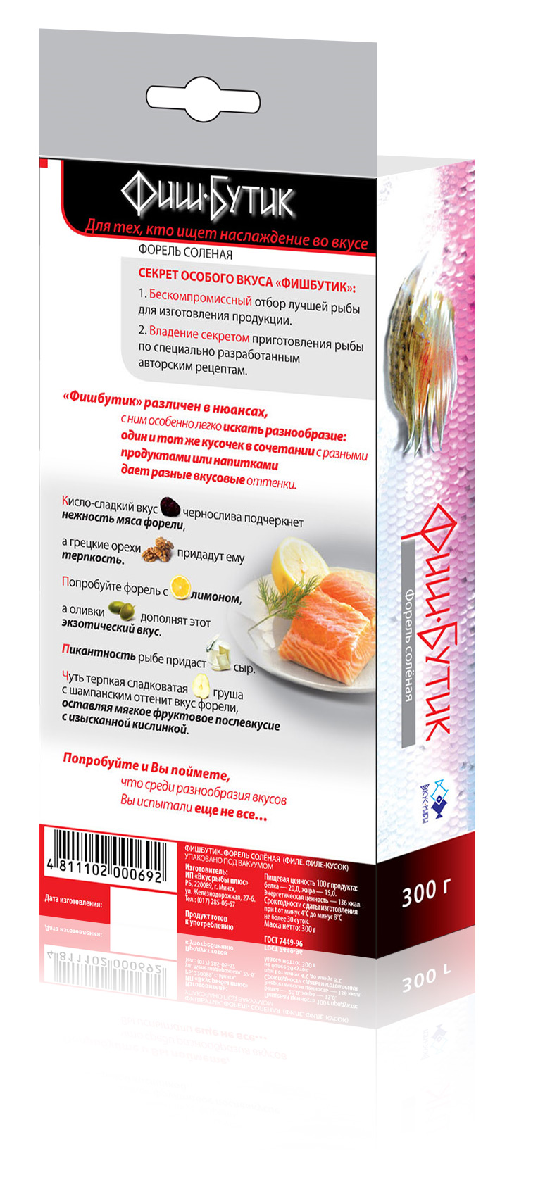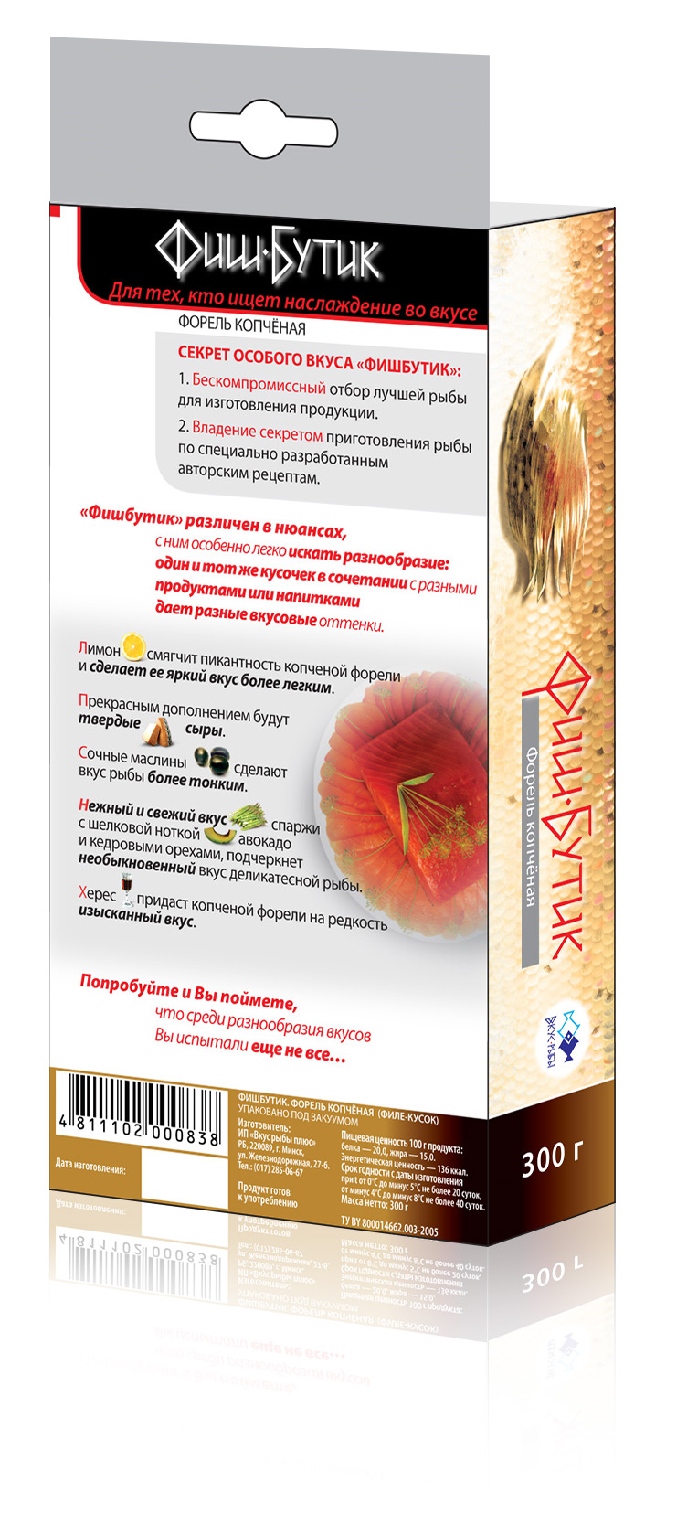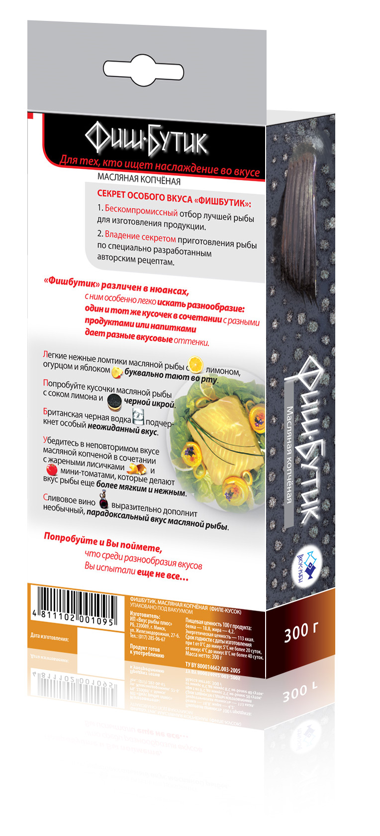 Белорусов накормят рыбой с «парадоксальным вкусом». Упаковка бренда «Фишбутик» от TiroРекламная фирма «Tiro» разработала имя, логотип и упаковку высококачественной, отборной рыбы премиум-класса, приготовленной по специально разработанным авторским рецептам одного из крупнейших производителей рыбной продукции в Беларуси компании «Вкус рыбы».ТМ «Фишбутик» создана специально для потребителей-ценителей наивысшего качества деликатесной рыбной продукции. У представленной на рынке РБ деликатесной рыбы (слабосоленой, подкопченной) подход един: в основе позиционирования продукции доминирует характеристика «Дорого!». Это единственное, что все «рыбные» компании сообщают через ТМ, этикет. Разница лишь в том, какая картинка нарисована на титульной стороне. Из-за этого потребитель в большинстве своем воспринимает продукцию только как праздничную, банкетную и ставит ее на стол лишь по праздникам, для закуски рядом с мясной нарезкой. Перед Trio стояла задача создать ТМ для определенной целевой группы потребителей: тонких ценителей, для гурмэ (с французского «ценитель»), которые ищут вкусовые приключения, нюансы. «Подсказать» им как можно использовать продукт не только за праздничным столом, превратив обычный вечер или выходной день в тонкое, изысканное, незабываемое развлечение. Решение Имя «Фишбутик» — это что-то небольшое, изысканное не для каждого, для ценителей. Это не просто дорого — это для людей, которые что-то ценят — для эстетов. Деликатесная рыба имеет то, что отличает ее от дешевой — тонкие вкусовые оттенки. Упаковка Образ упаковки создан в виде «целой рыбы», где на лицевой стороне в окошечко видно само рыбное мясо, лежащее в этой упаковке. Оборотная сторона упаковки используется для того, чтобы рассказать о том, какое сочетание рыбы с другим продуктом (с вином, оливками, лимоном и т.д.) дает конкретный вкусовой оттенок. О том, что каждая рыба разнообразна в нюансах вкуса, а в сочетании с разными продуктами или напитками дает разные вкусовые оттенки. Это своеобразная карта вкусов для настоящих гурмэ, приглашающая к увлекательному путешествию. |