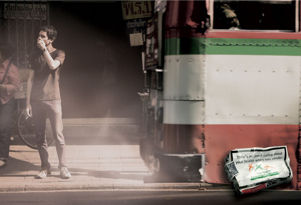 Thai Health Promotion Foundation: нет необходимости заботиться о своем здоровье, когда ты куришьКак утверждают креаторы из рекламного агентства Y&R Bangkok, разработавшие этот плакат по заказу тайской организации Thai Health Promotion Foundation, просто глупо зажимать нос рукой, защищаясь от ядовитых выхлопов общественного транспорта, когда в другой руке ты держишь сигарету.Отметим, что организация Thai Health Promotion Foundation достаточно часто пользуется услугами рекламных агентств. Так креаторы из TBWA разработали по ее заказу особое "офисное" спортивное снаряжение, а таиландцы из Euro RSCG Flagship вставили в рот ребенку сигарету. Слоган: "Нет необходимости заботится о своем здоровье, когда ты куришь." Агентство: Y&R Bangkok Творческий директор: Trong Tantivejakul Арт директор: Nares Limapornvanich Копирайтер: Jittra Thiutipsakul Ретушь: Sombat Piyaboon (Cubic) Фотограф: Tarnit Bujakorn |