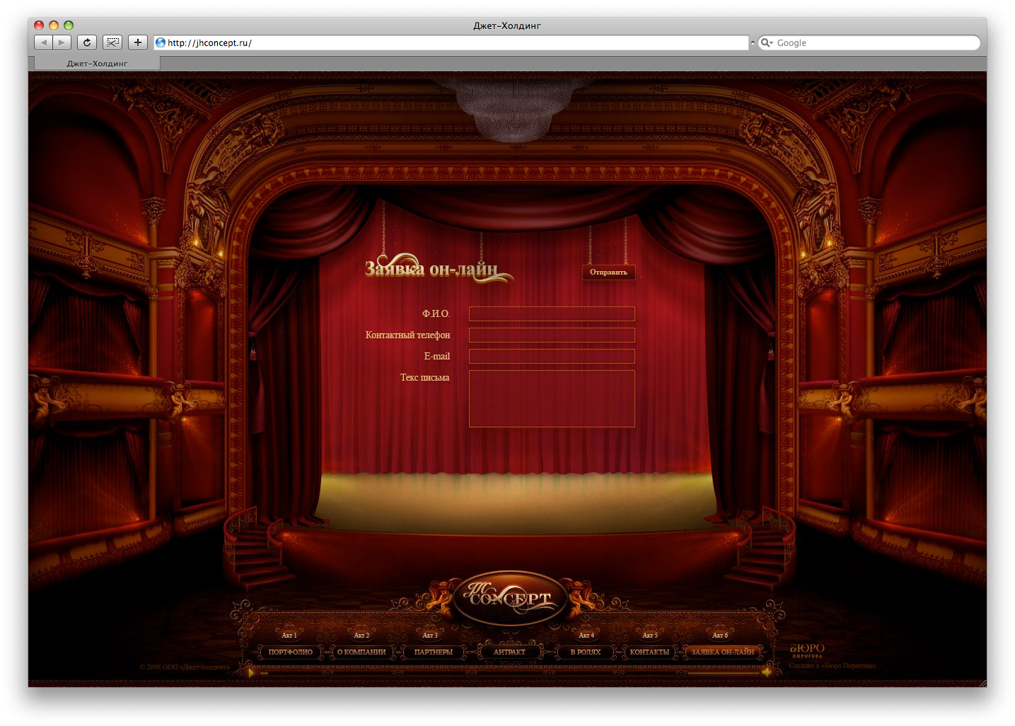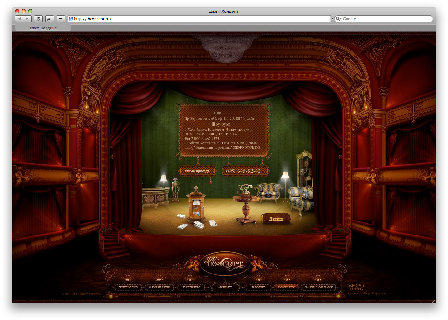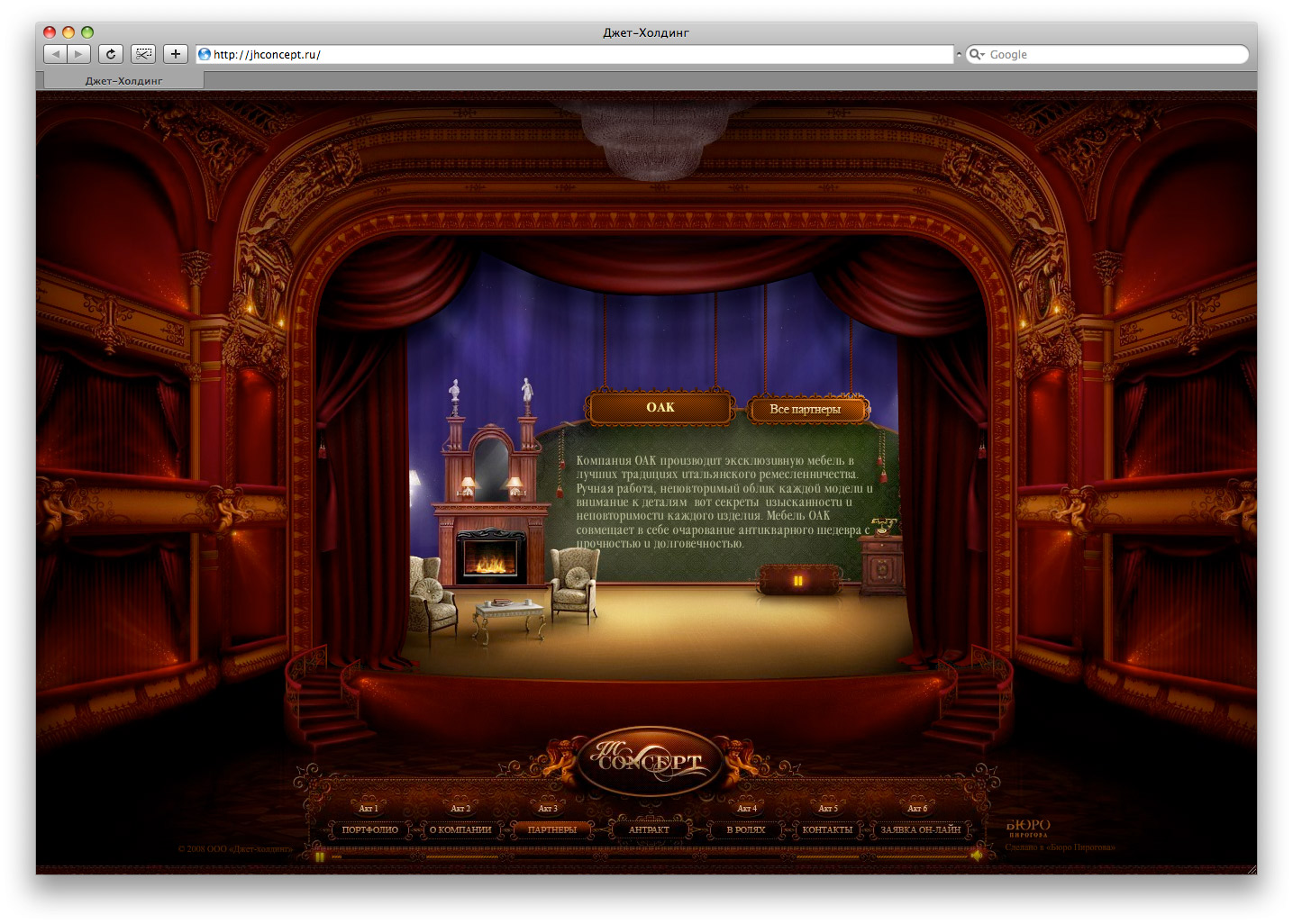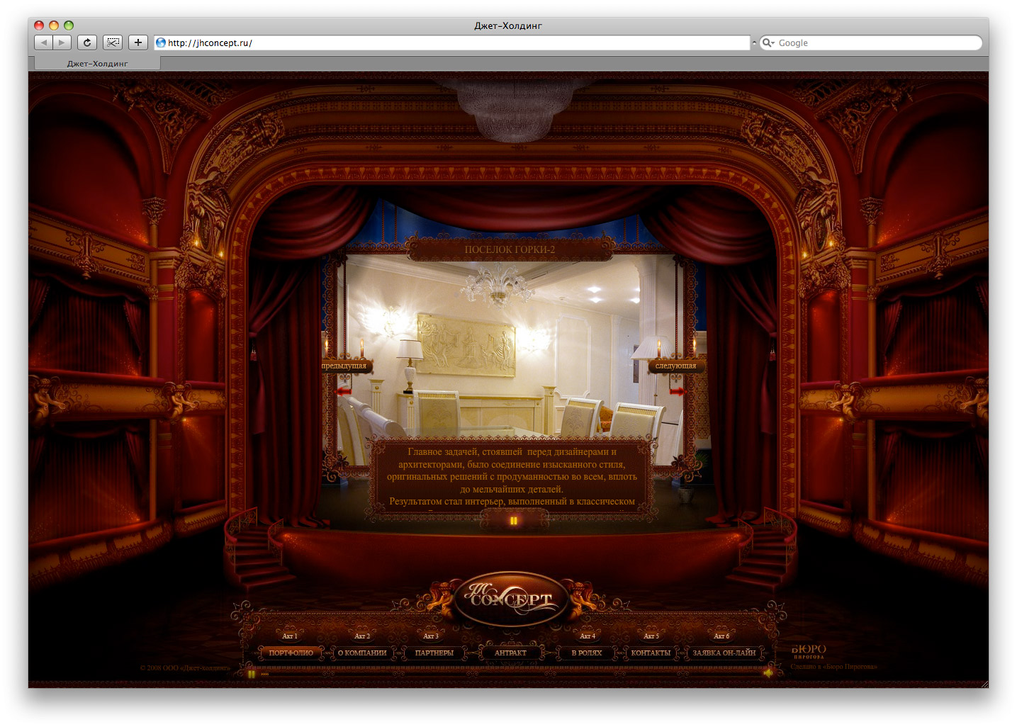 Бюро Пирогова построило театр на сайте компании Джет-ХолдингБюро Пирогова завершило работу над сайтом для Джет-Холдинг - компании, которая уже более 12 лет занимается комплексным проектированием и созданием роскошных дворцовых интерьеров. Бюро Пирогова разработало оригинальную концепцию сайта, соответствующую пожеланию заказчика – получить эксклюзивное решение, способное удивить и заинтриговать взыскательную публику. Вдохновением послужил театр как воплощение по-настоящему роскошных, эксклюзивных интерьеров. Это театр одного зрителя, который может управлять действием с помощью персонального пульта (меню сайта). История изложена в виде пьесы об интерьерах в 7 актах, в ходе которой он знакомится с компанией Джет-Холдинг и ее сотрудниками, портфолио, крупнейшими партнерами. А в антракте для зрителя приготовлен сюрприз – выступление пианиста. Дизайнерами Бюро Пирогова был разработан собирательный образ театра и уникальный дизайн каждого акта пьесы с декорациями. Детали проработаны до мелочей: кулисы, например, смоделированы в 3D для того, чтобы их движение выглядело реалистичным. В разделе «портфолио» реализована схема стилизации под видео - на экране демонстрируется интерьер, но это не видео, а изображение. Благодаря чему решается проблема добавления работ клиентом самостоятельно. |