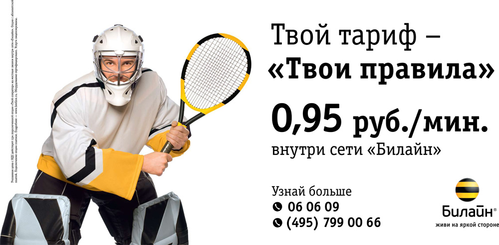 "Билайн" не играет в хоккей клюшкой"Билайн" рекламирует новый тарифный план "Твои правила" на хоккейном полеКампания, которая стартовала 16 февраля и продлится до конца марта, задействует такие каналы коммуникации, как телевидение и наружная реклама. Видео создано агентством BBDO Moscow. Размещением на ТВ занималось агентство "Максус", на внешних носителях - "МедиаВест". Героем ролика стал вратарь-хоккеист, который, в знак презрения к правилам игры, отбивает шайбу чем попало. В ход идут теннисная ракетка и даже бейсбольная бита. Слоган: "Твоя игра - твои правила". |