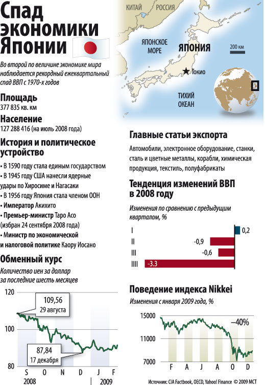 Тем временем, по официальным данным правительства страны, рост экономики Японии снизился до 3,3% в последнем квартале прошлого года. В долгосрочной перспективе это означает спад. С октября по декабрь 2008 года экономика страны замедлилась но 12,7%. Это самый худший показатель со времени нефтяного кризиса 1970-х годов. Кроме того, темпы спада второй крупнейшей экономики мира быстрее, чем нынешние потери США и стран Европы.
