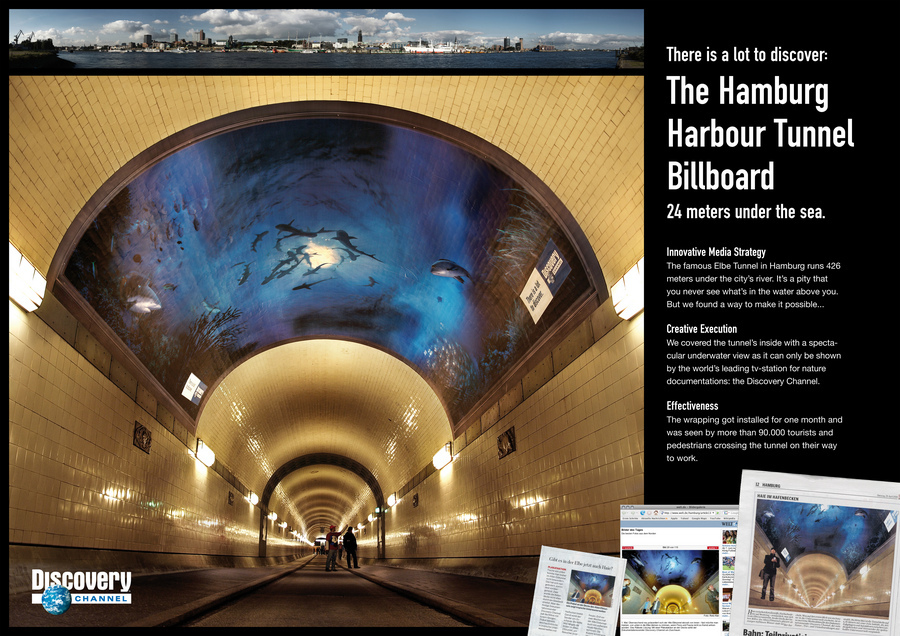 Discovery Channel помогает взглянуть на морскую безднуНеобычным рекламным носителем стал туннель Elbe, который соединяет северную Германию и Европу с землей Шлезвиг-Гольштейн и Данией. Гагантский билбоард, показывает живописную картину морской жизни, которую можно увидеть только благодаря каналу Discovery. Фигурально билборд отвечает на вопрос, которым задаются тысячи людей каждый день проходящих по туннелю Elbe: "Что происходит в воде над нами? ".В течение месяца билбоард увидело более 90000 туристов и людей, идущих на работу Агентство: DDB Germany, Berlin Клиент: Discovery Channel |