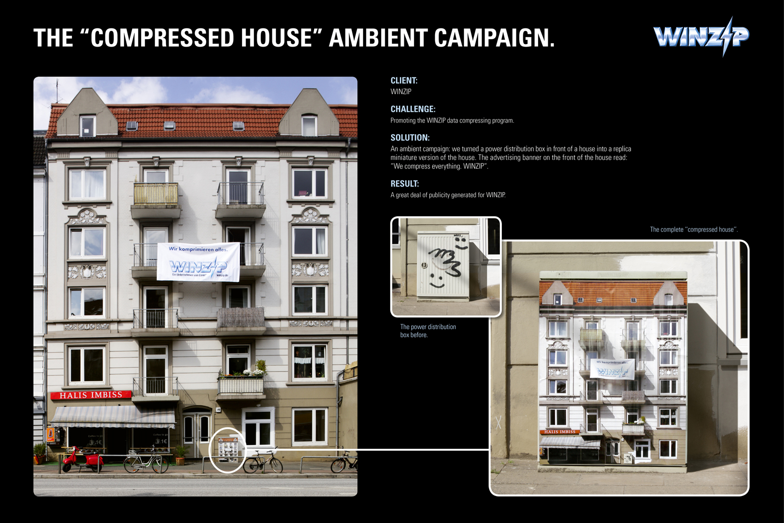 Заархивированный дом от WINZIPWinZip - условно-бесплатный файловый архиватор и компрессор для Microsoft Windows, созданный канадской компанией Corel. PKZIP является основным форматом этой программы, хотя поддерживаются и другие архивные форматы.Чтобы продемонстрировать качество сжатия этого архиватора, немецкие креаторы из РА Grabarz und Partner организовали эмбиент кампанию, создав уменьшенную "заархивированную" копию настоящего дома. Слоган: "Мы сжимаем все". Агентство: Grabarz und Partner, Германия Творческий директор: Djik Ouchiian, Martin Grau Арт-директор: Thorsten Sievering Копирайтер: Max Benrath |