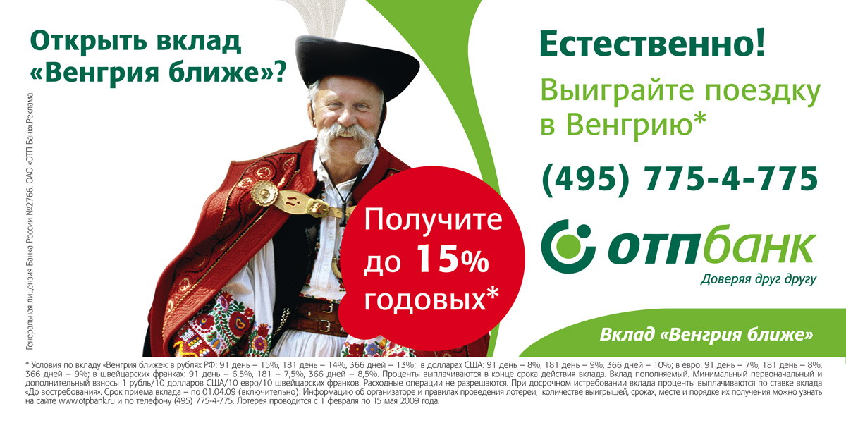ОТП Банк будет дарить Венгрию - в виде салями, горошка и турпутевокКто-то дарит за открытие вкладов кепки, брелоки, игрушки и прочие "полезные" подарки, а ОТП Банк отправляет клиентов в Венгрию. С 1 февраля в Москве и регионах присутствия банка стартовала акция "Венгрия ближе" по продвижению одноименного вклада. Помимо достаточно высоких для "дочек" зарубежных банков процентов по вкладу, главная "фишка" акции - розыгрыш 7 поездок на двоих на родину ОТП Банка."Чтобы почувствовать вкус Венгрии прямо сейчас, вкладчики могут получить комплименты от банка в виде типичных венгерских продуктов, - обещают маркетологи. - Каждый из нас помнит горошек Globus и знакомый с детства вкус венгерской салями, а кто-то впервые попробует токайское вино или предмет особой гордости венгров - оригинальный ликер Zwack. Все это в фирменной упаковке". В качестве рекламных решений используются понятные российскому глазу и слуху образы - радостный венгерский музыкант в национальном костюме, венгерские флаги и знаменитый "Чардаш" в радио-ролике. Рекламная кампания в Москве, Санкт - Петербурге, Самаре, Нижнем Новгороде и Омске стартовала со 2 февраля. Задействованы наружная реклама, пресса, радио, метро и Интернет. Состав творческой группы Рекламная кампания организована in house сотрудниками Управления маркетинга и рекламы: Александр Рукавишников (начальник Управления маркетинга и рекламы - заместитель директора Дирекции маркетинга и стратегических коммуникаций) Илья Назаров (начальник Отдела продвижения банковских продуктов) Камила Такташева (главный специалист Отдела продвижения банковских продуктов) Игорь Плискунов (главный специалист Отдела рекламного производства) |