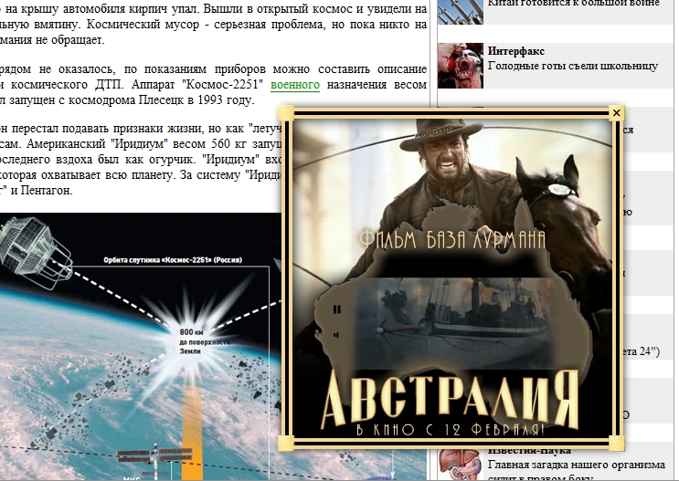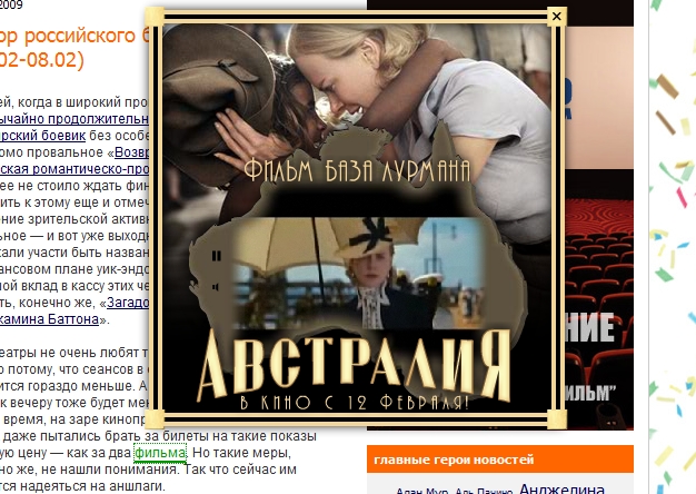 Креатив и кино: итоги рекламной кампании фильма "Австралия"22 февраля в Интернете завершилась рекламная кампания фильма "Австралия", которая проводилась агентством интернет-рекламы Nectarin для 20th Century Fox. Эта рекламная кампания стала первым опытом использования брендированного плеера Videoclick в качестве одного из инструментов подачи рекламного сообщения.Внешнее оформление видеоплеера существенно отличалось от его обычного исполнения и по цветовой гамме и по размерам: брендированный плеер был выполнен в бежево-серых тонах, соответствующих тонам оформления постера картины, большего размера и с измененной панелью хронометража ролика. Как и прежде, плеер появлялся перед пользователем только после осознанного наведения им курсора мышки на специально залинкованное тематическое слово. Помимо внешнего оформления, усложнилось и внутреннее наполнение плеера: к проигрываемому видео было решено добавить кадры из фильма, которые возникают одновременно с трейлером. Таким образом, перед пользователем открывается захватывающая картина: сменяющие друг друга кадры, на фоне которых проигрывается трейлер, оформленный виде очертаний острова Австралия. Рекламная кампания проходила более чем на 20 площадках, где залинкованные слова выбраны с учетом содержания фильма, например: Австралия, драма, война, англичанка, любовь, Николь Кидман. CTR составил 2,04 %, общее количество показов достигло отметки 36 259. |