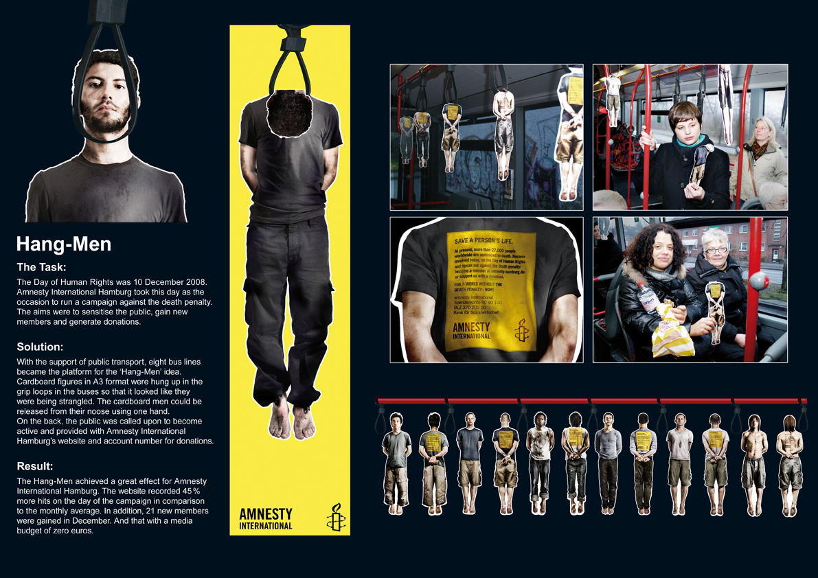 Amnesty International "повесило" людей в транспорте ГамбургаГде только умельцы не размещают рекламные сообщения в общественном транспорте: в качестве рекламной площади уже освоены стены, стекла и спинки сидений. Ну а в последнее время очередь дошла и до ручек, за которые держатся пассажиры, стоящие в салоне автобусов во время движения.Именно этот рекламный носитель решили использовать креаторы из немецкого агентства Tribal DDB, "повесив" по заказу всемирно известной организации Amnesty International на этих самых ручках множество людей-листовок. Кампания приурочена ко Дню прав человека, который, начиная с 1950 года, ежегодно празднуется 10 декабря, а ее цель - обратить внимание общественности на проблему смертной казни, которая все еще практикуется во многих странах мира. Слоган: "Спаси человеческую жизнь. В настоящее время более 27 000 человек по всему миру приговорены к смертной казни. Прими участие сегодня, в День прав человека, и выступи против смертной казни: стань членом amnesty-hamburg.de или поддержи нас при помощи пожертвования. За мир без смертной казни сейчас!" Агентство: Tribal DDB, Гамбург, Германия Творческий директор: Martin Drust Копирайтер: Florentin Hock Арт-директор: Marjorieth Alzen-Sanmartin, Janis Zinke Графический дизайн: Wiebke Auerswald Фотограф: Anke Luckmann Другое: Andre Kruwel, Claudia Andert Пост-производство: Christian Kunz, Gloss |