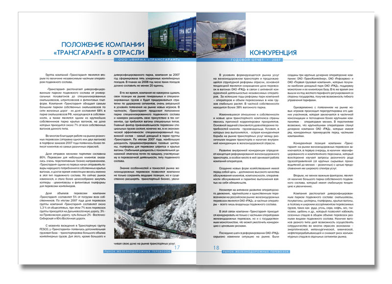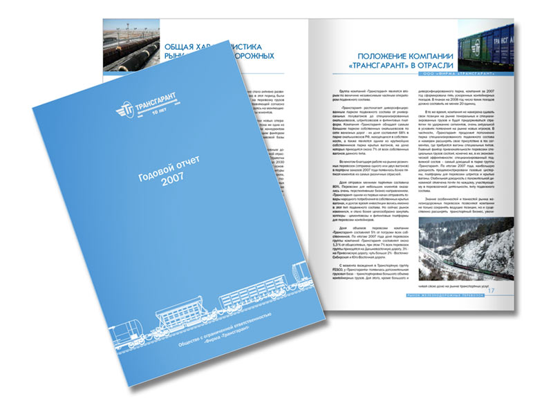 Zebra-Group помогла "Трансгаранту" отчитатьсяZebra-Group завершила работу над годовым отчетом компании "Трансгарант", специализирующейся на железнодорожных перевозках.В издании подведены итоги деятельности грузоперевозчика в 2007 году, представлен анализ развития российского рынка железнодорожных перевозок, финансовая отчетность, раскрыты нематериальные показатели, описаны стратегия, миссия и цели развития компании, кадровая и социальная политика, благотворительная деятельность. Оформление годового издания выдержано в фирменном стиле компании. Отчет выпущен на русском и английском языке. Состав творческой группы "Трансгарант": Начальник отдела маркетинга - Александр Анатольевич Метёлкин Zebra-Group: Руководитель проекта - Евгений Вражкин Дизайн и верстка - Андрей Волгин, Александр Бардиян Иллюстрации - Екатерина Антипина |