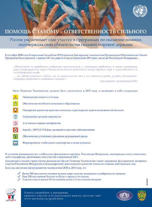 ООН поддержат рекламной кампанией в прессеВ России стартовала федеральная информационная кампания в поддержку программы "Цели развития тысячелетия" ООНИнициатор информационной программы - Фонд поддержки социальных и информационных программ государственных ведомств "Народная инициатива". В рамках стратегического планирования реализации "ЦРТ" в России, Фондом был учрежден Центр содействия реализации ЦРТ, который будет не только координировать ход выполнения основных задач, но и расширять круг экспертов, вовлеченных в процесс реализации программы. Поддержку Фонду оказали Министерство Финансов РФ, Министерство Иностранных дел РФ и представительство ООН в РФ, выделив своих представителей в состав Попечительского совета Центра. Главная задача первого этапа социальной программы - подробное информирование россиян о целях и задачах гуманитарной программы "Цели тысячелетия" и роли Российской Федерации в этой программе. В рамках реализации проекта, в ведущих печатных СМИ были уже размещены информационные макеты, разъясняющие аудитории главные принципы и задачи программы "ЦРТ". В планах Центра содействия реализации ЦРТ в России - увеличение интенсивности информационной кампании, активная пропаганда гуманитарных ценностей ООН, привлечение к обсуждению актуальных общественных проблем ведущих российских и международных экспертов, представителей государственной власти и ведущих средств массовой информации. |