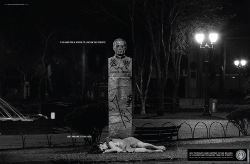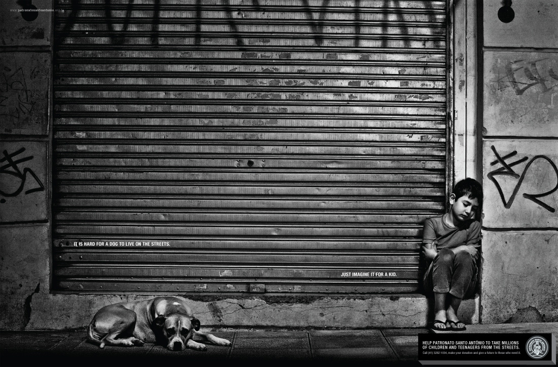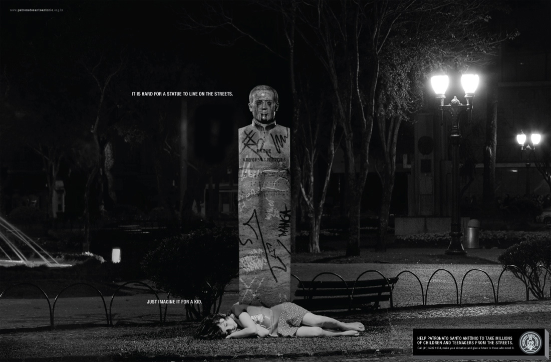 Жизнь бездомных детей не лучше жизни памятника"Помогите нам забрать с улиц миллионы детей и подростков" - под таким лозунгом бразильское агентство Bronx разработало серию принтов для благотворительной организации Patronato Santo Antonio, которая оказывает помощь бездомным детям. Чтобы обратить внимание общественности на проблему бездомных детей, креаторы решили сравнить их положение с положением разрисованного и искалеченного памятника или бездомной собаки…Слоган: "Статуе / собаке тяжело жить на улице. Просто представьте, что чувствуют дети." Агентство: Bronx, Куритиба, Бразилия Творческий директор: Alexandre Silveira Копирайтер: Fabio Duarte Арт-директор: Danilo Nagami, Keith Lauer Фотограф: Antonio Wolff, Lux Lab Studio |