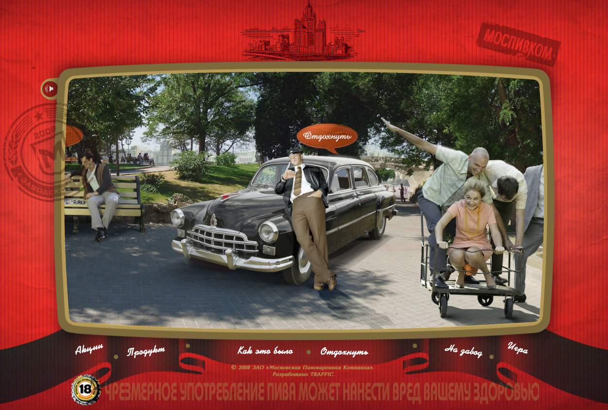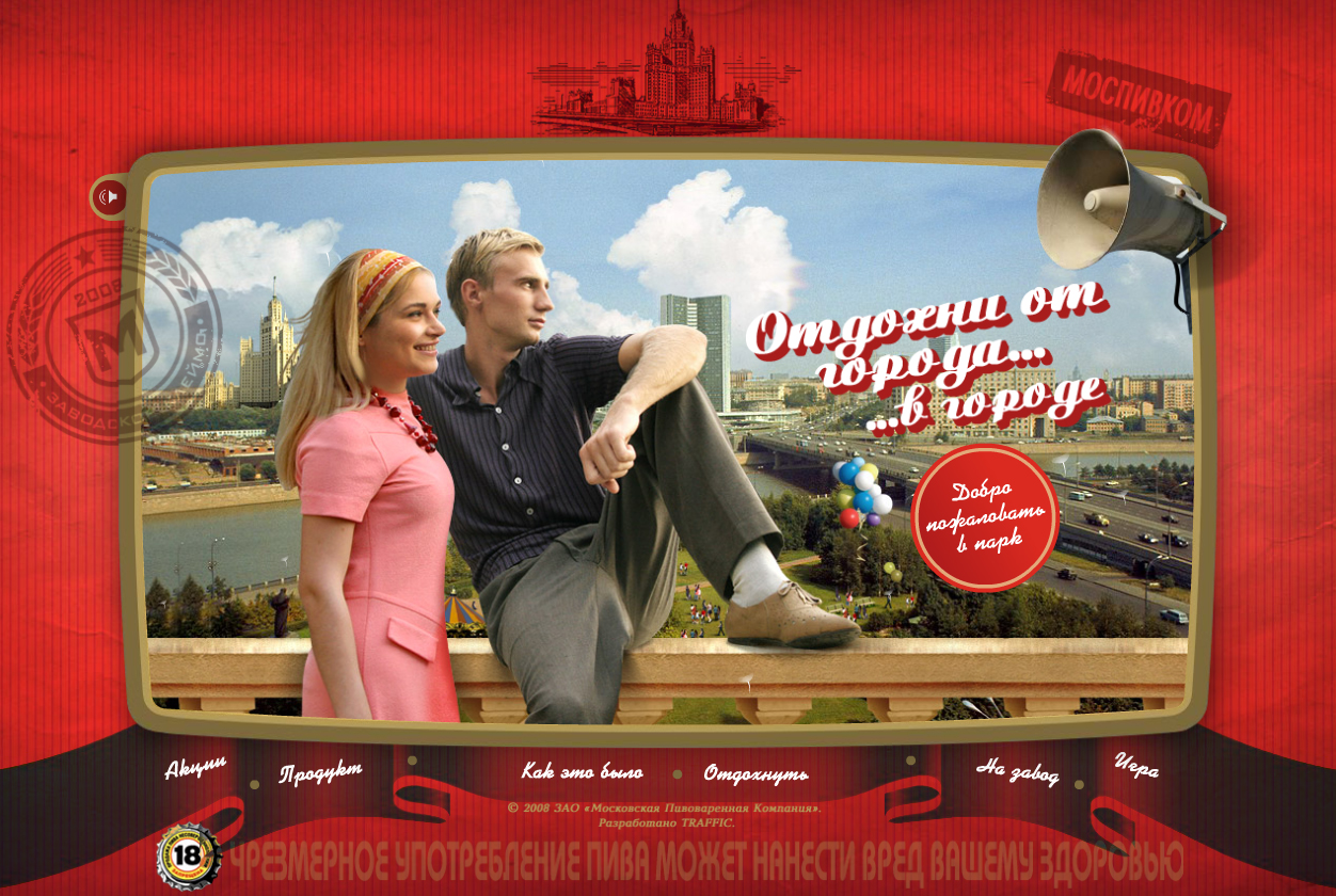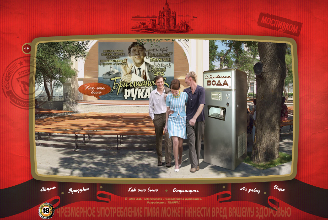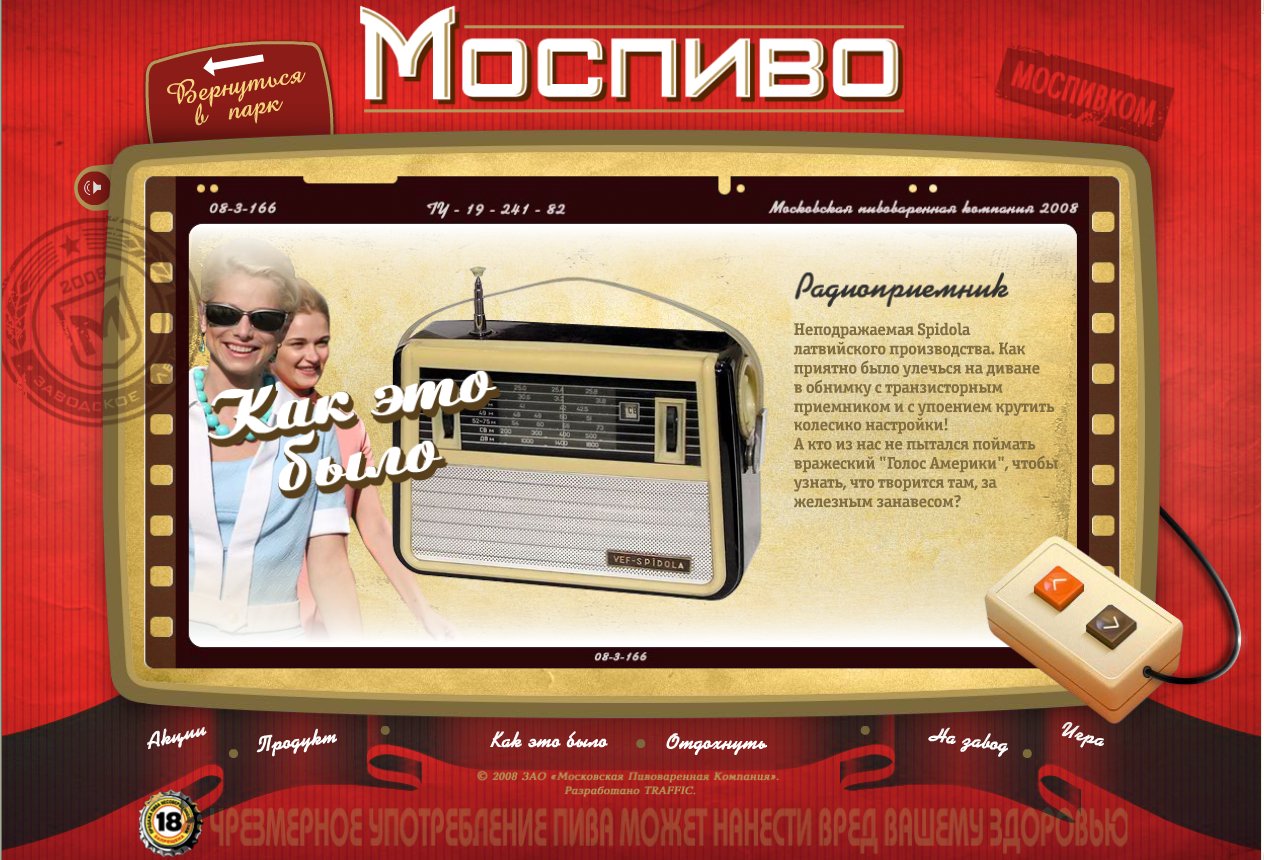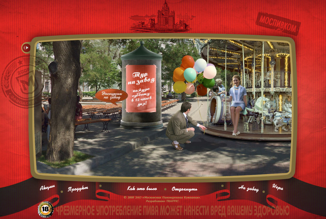 "Сайт Моспиво - это квинтэссенция приятных воспоминаний из прошлого с легким акцентом ностальгии. Здесь вы найдете множество интересного: атрибуты светлого советского прошлого, информацию о местах отдыха в Москве, приглашение посетить пивоваренный завод, где производится МОСПИВО и даже занятную игру "Спортлото" - с еженедельными розыгрышами ящика фирменного пива", - рассказывает Traffic.