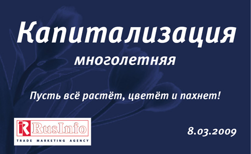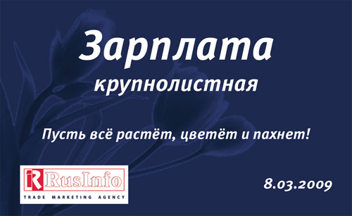 Компания Rusinfo подарила прибыль своим клиентамTrade Marketing Agency Rusinfo уже не первый праздник готовит для своих клиентов особенные поздравления - подарки, которые удивляют своим нестандартным исполнением и индивидуальным подходом.Новогодние подарки - персональные мерчандайзеры, которые легко и непринужденно обеспечивают "Счастливые продажи в Новом году", цветы к 8 марта, которые с нежностью напомнят о необходимости беречь и приумножать прибыль... Выполнено креативной студией "Такилииначе".