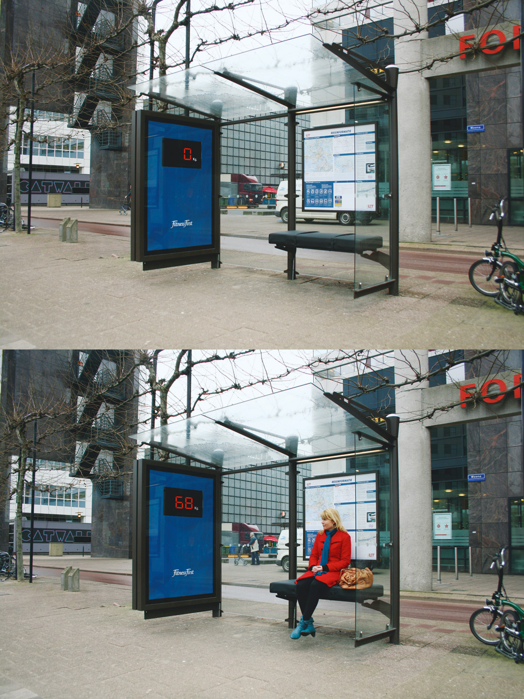 Fitness First взвешивает пассажиров АмстердамаРазработав оригинальную кампанию для фитнес-центра Fitness First, нидерландское рекламное агентство N=5 помогло пассажирам городского транспорта постоянно контролировать свой вес. Для этого креаторы вмонтировали в конструкцию транспортных остановок специальные весы, которые отображали вес каждого присевшего на лавку человека. Если вес пассажира укладывался в общепринятые нормы, то ему можно было только позавидовать, а если нет -добро пожаловать на занятия в Fitness First!Агентство: N=5, Амстердам, Нидерланды Творческая группа: Marco de Jong, Thijs Bontje, Jurriaan Noij |